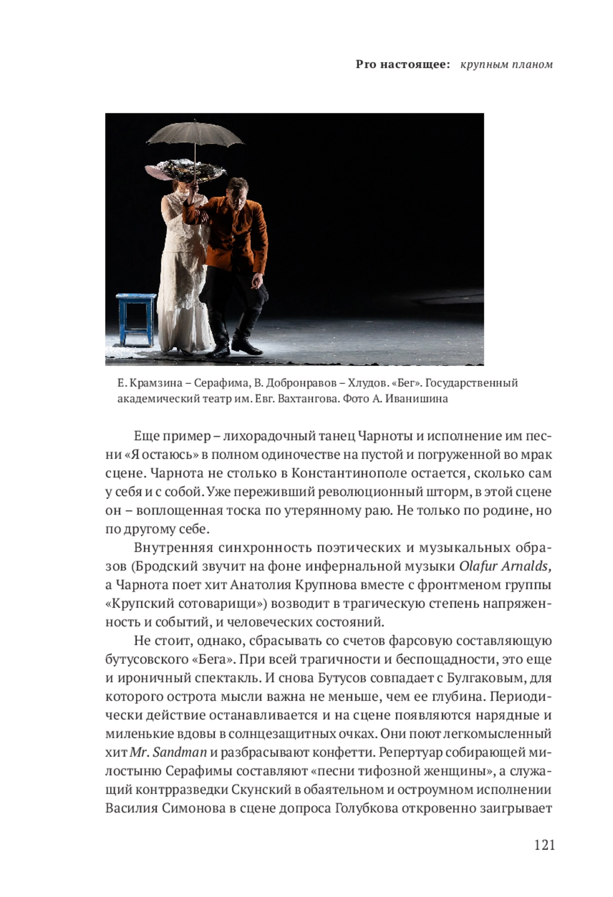 «Бег» – спектакль, исполненный энергетической мощи и живописной выразительности. Бутусов поднимается в нем до высот философского осмысления действительности. Его не слишком заботят политические катаклизмы и тем более переклички с сегодняшним днем. Фразу Хлудова «Крым сдан» ошибочно рифмуют с современными реалиями. Взаимоотношения режиссера с пьесой гораздо сложнее. Бутусов не иллюстрирует и не «обслуживает» сюжет, а ставит спектакль «поверх» первоисточника, сохраняя дистанцию между автором и собой сегодняшним. Пьеса Булгакова для него шире, чем точка отсчета для создания собственного произведения или источник вдохновения, она – его собеседник в разговоре, главной и вечной темой которого является побег от себя и своих собственных травм и кошмаров. «Сновидческая» форма пьесы идеально совпадает с поэтикой режиссера, с его театропониманием и мирочувствованием. Реальность распадается на куски прямо на глазах у зрителя, а горячечный бред героев явлен наглядно и выразительно и рождает широкий спектр ассоциаций и метафор, призванных придать повествованию кардинальное звучание.