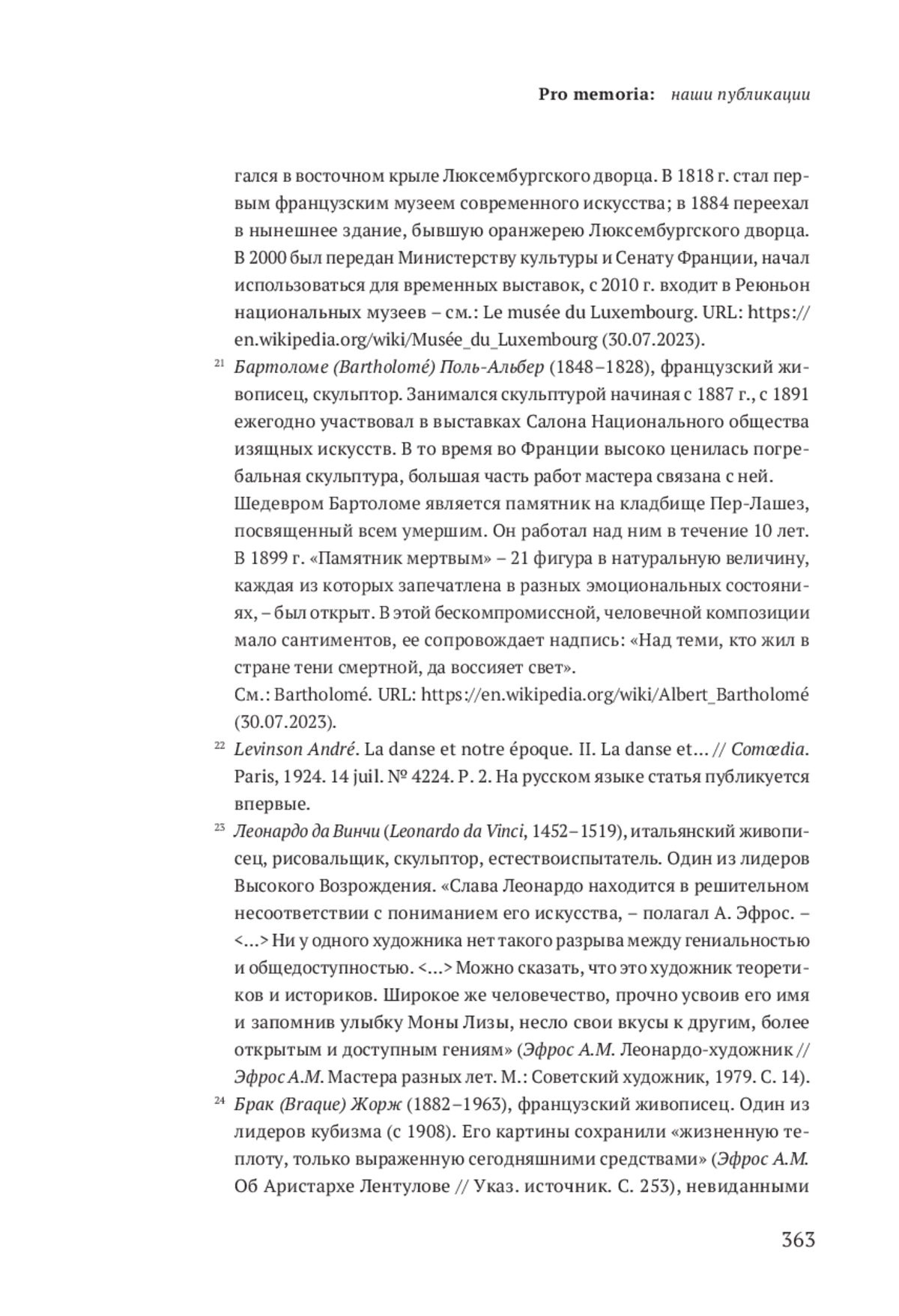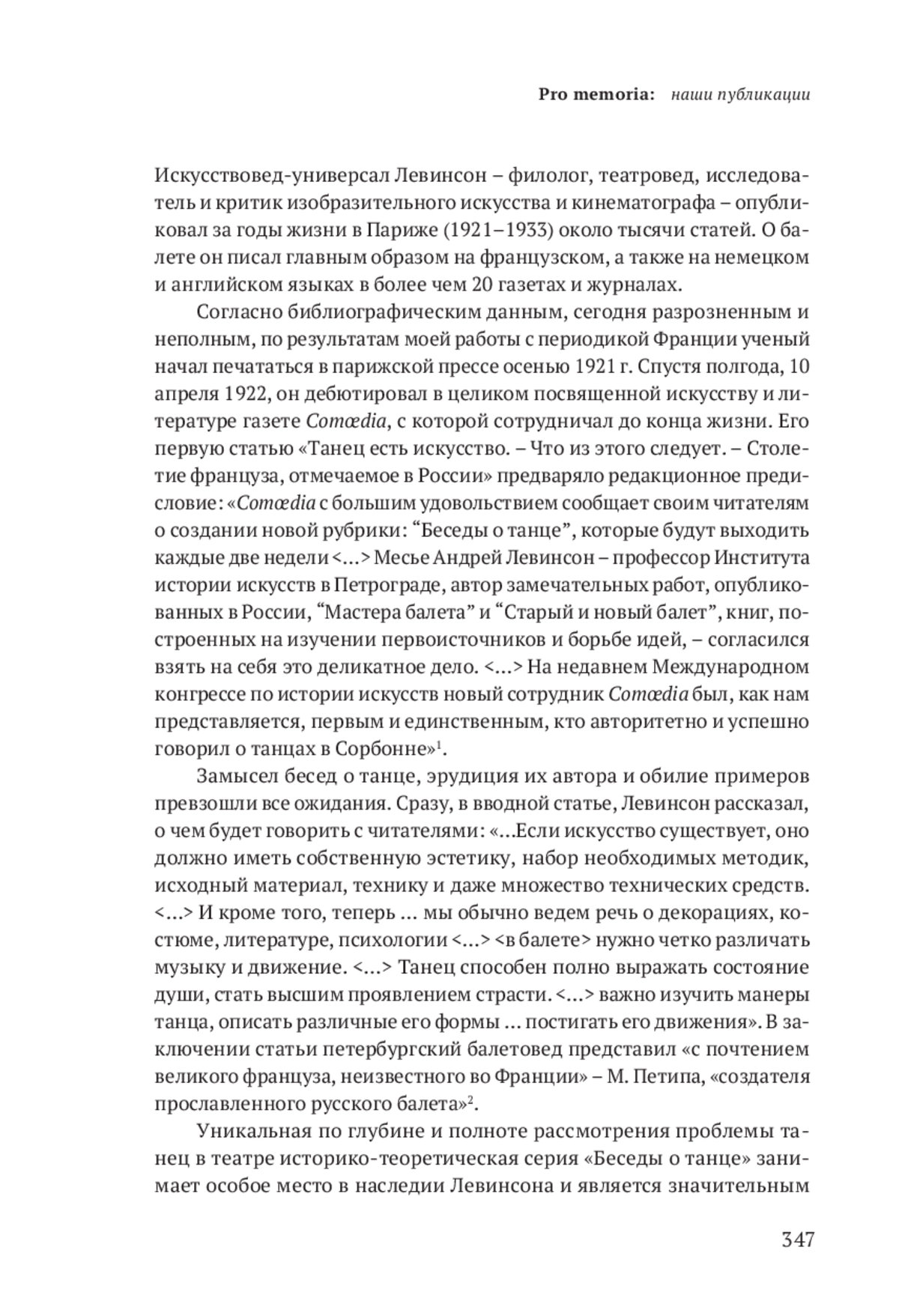 В России известна малая толика наследия А. Я. Левинсона-балетоведа: только вышедшие на родине труды «Мастера балета» (1915), «Старый и новый балет» (1918), переизданные в 2008 г. До сих пор не собраны воедино и не републикованы многочисленные его выступления в периодике Петербурга / Петрограда и других городов нашей страны. Рассеянные по разным библиотекам, лишь отчасти оцифрованные, они труднодоступны даже специалистам. Не введены в научный обиход работы о русском танцевальном искусстве за границей, которые были написаны в эмиграции на русском языке.