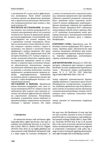 ВВЕДЕНИЕ. Статья исследует мониторинг соблюдения прав человека в рамках Всеобщей системы преференций (далее – ВСП) Европейского союза (далее – ЕС). Цель работы – проанализировать, как ЕС использует торговые преференции для продвижения прав человека в развивающихся странах, уделяя особое внимание эффективности механизмов мониторинга и процедур отмены преференций. Задачи исследования включают: изучение этапов развития программ ВСП ЕС; анализ нынешней системы мониторинга; оценку недавнего случая частичного отзыва преференций у Камбоджи; а также выявление сильных и слабых сторон системы с предложениями по ее улучшению.