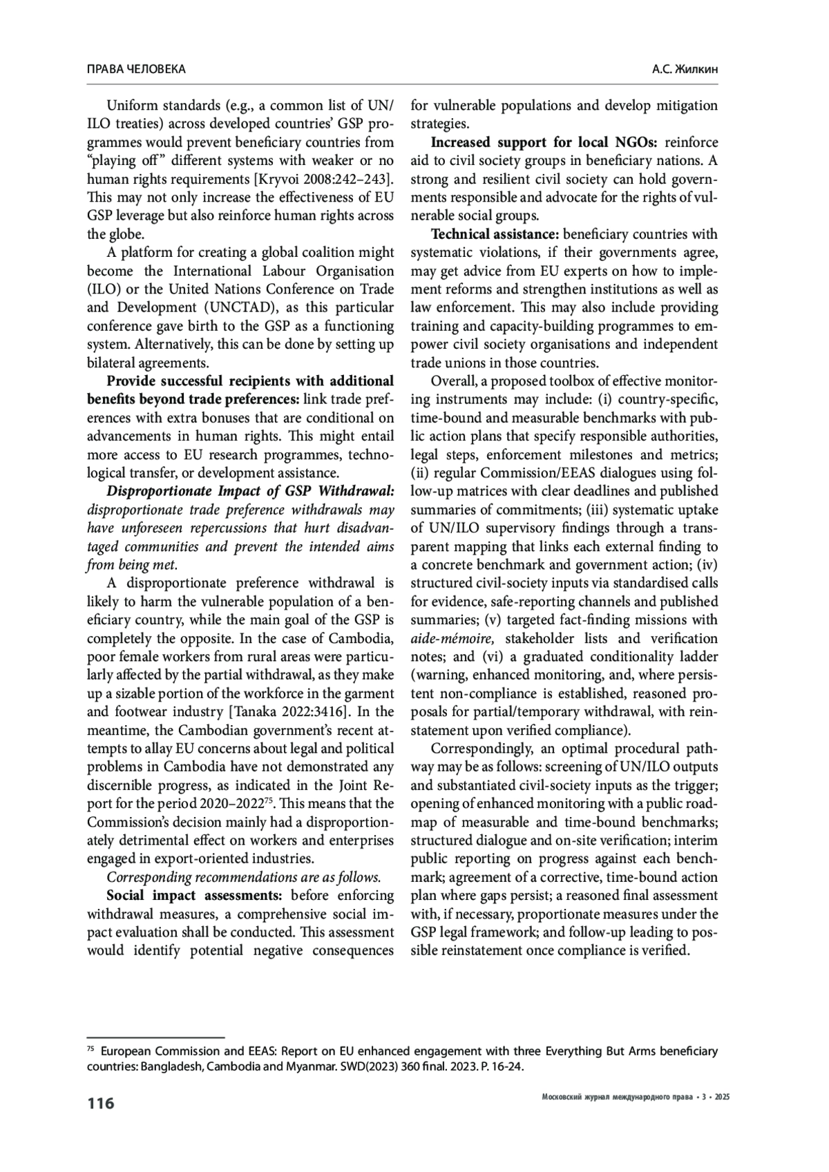 ОБСУЖДЕНИЕ И ВЫВОДЫ. Проведенный анализ позволяет утверждать, что, хотя система мониторинга ВСП ЕС создает основу для продвижения прав человека через торговую политику, для большей эффективности необходимы существенные улучшения. Рекомендации включают: установление четких ожиданий по проведению реформ, направленных на улучшение ситуации с правами человека, для стран с учетом их экономической и социальной ситуации, повышение прозрачности через проведение публичных слушаний и раскрытие «списков проблем»; проведение оценок социальных последствий до отмены преференций; координацию с другими развитыми странами для выработки единого подхода. Программа ВСП+ выделяется использованием подхода кнута и пряника, однако ЕС необходимо балансировать между чрезмерным давлением и минимизацией негативных последствий для уязвимых групп в странахбенефициарах.