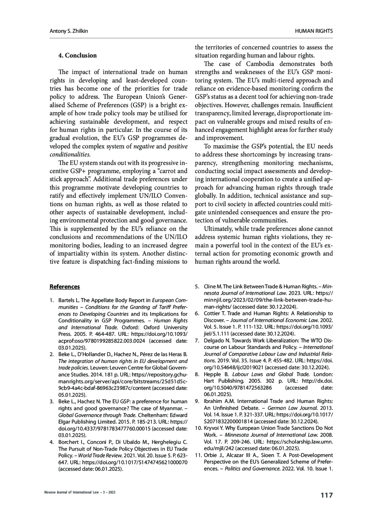 МАТЕРИАЛЫ И МЕТОДЫ. Исследование основано на комбинации методов, включая анализ документов ЕС, таких как Регламент (ЕС) № 978/2012 (основа текущих программ ВСП) и Делегированный регламент Комиссии (ЕС) № 1083/2013 (детализация процедуры отмены преференций). В рамках кейс-стади был изучен недавний отзыв части торговых преференций у Камбоджи в связи с массовыми нарушениями прав человека в стране, в частности, роспуском Партии национального спасения и арестом ее лидера Кем Сокха. Дополнительно изучены доклады мониторинговых органов Организации Объединенных Наций (далее – ООН), Международной Организации Труда (далее – МОТ) и институтов ЕС в целях оценки эффективности мониторинга. Такой подход позволяет системно оценить как формальные процедуры, так и практическую реализацию обусловленности (кондициональности) прав человека в торговой политике ЕС.
