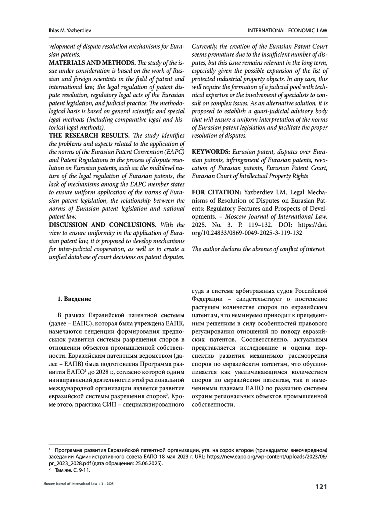 ВВЕДЕНИЕ. В 2023 г. Евразийская патентная организация (далее – ЕАПО) подготовила и опубликовала Программу развития ЕАПО до 2028 г. (далее – Программа развития ЕАПО), согласно которой одним из направлений деятельности этой региональной международной организации является развитие евразийской системы разрешения споров. Кроме этого, практика Суда по интеллектуальным правам (далее – СИП) – специализированного суда в системе арбитражных судов Российской Федерации – свидетельствует о постепенно растущем количестве споров по евразийским патентам, что неминуемо приводит к прецедентным решениям в силу особенностей правового регулирования отношений по поводу евразийских патентов. В связи с этим представляется актуальным исследование и оценка перспектив развития механизмов рассмотрения споров по евразийским патентам.