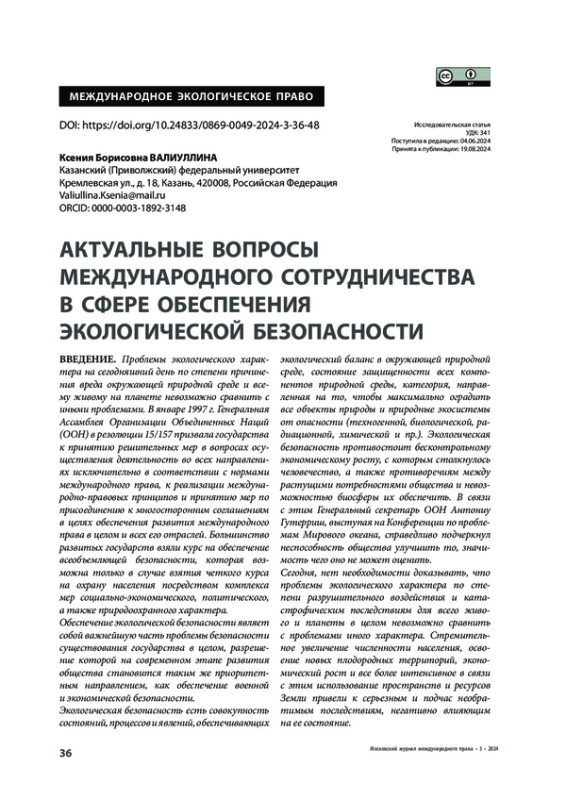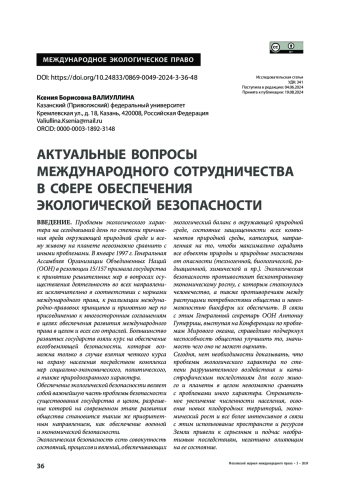 ВВЕДЕНИЕ. Проблемы экологического характера на сегодняшний день по степени причинения вреда окружающей природной среде и всему живому на планете невозможно сравнить с иными проблемами. В январе 1997 г. Генеральная Ассамблея Организации Объединенных Наций (ООН) в резолюции 15/157 призвала государства к принятию решительных мер в вопросах осуществления деятельность во всех направлениях исключительно в соответствии с нормами международного права, к реализации международно-правовых принципов и принятию мер по присоединению к многосторонним соглашениям в целях обеспечения развития международного права в целом и всех его отраслей. Большинство развитых государств взяли курс на обеспечение всеобъемлющей безопасности, которая возможна только в случае взятия четкого курса на охрану населения посредством комплекса мер социально-экономического, политического, а также природоохранного характера. Обеспечение экологической безопасности являет собой важнейшую часть проблемы безопасности существования государства в целом, разрешение которой на современном этапе развития общества становится таким же приоритетным направлением, как обеспечение военной и экономической безопасности. Экологическая безопасность есть совокупность состояний, процессов и явлений, обеспечивающих экологический баланс в окружающей природной среде, состояние защищенности всех компонентов природной среды, категория, направленная на то, чтобы максимально оградить все объекты природы и природные экосистемы от опасности (техногенной, биологической, радиационной, химической и пр.). Экологическая безопасность противостоит бесконтрольному экономическому росту, с которым столкнулось человечество, а также противоречиям между растущими потребностями общества и невозможностью биосферы их обеспечить. В связи с этим Генеральный секретарь ООН Антониу Гутерриш, выступая на Конференции по проблемам Мирового океана, справедливо подчеркнул неспособность общества улучшить то, значимость чего оно не может оценить. Сегодня, нет необходимости доказывать, что проблемы экологического характера по степени разрушительного воздействия и катастрофическим последствиям для всего живого и планеты в целом невозможно сравнить с проблемами иного характера. Стремительное увеличение численности населения, освоение новых плодородных территорий, экономический рост и все более интенсивное в связи с этим использование пространств и ресурсов Земли привели к серьезным и подчас необратимым последствиям, негативно влияющим на ее состояние.