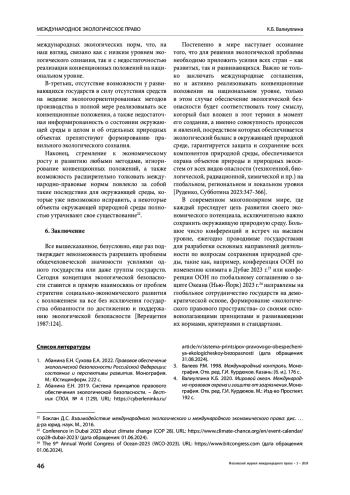 ОБСУЖДЕНИЯ И ВЫВОДЫ. Сохранение окружающей природной среды является комплексной задачей, требующей не только законодательного урегулирования как на международном, так и на внутригосударственном уровне, но и формирования правильного общественного сознания о его значимости для существования всего живого на планете, единстве экосистем и ценности всех компонентов окружающей природной среды, что, помимо прочего, позволит мировому сообществу сплотиться в рамках сотрудничества по глобальным природоохранным вопросам, созданию системы повсеместной экологической безопасности.