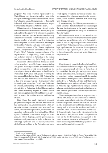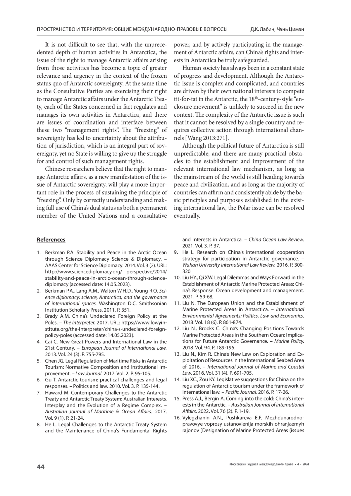 ОБСУЖДЕНИЯ И ВЫВОДЫ. Исследование проблем установления государственного суверенитета над территориями Антарктики с точки зрения Китая позволяет судить о том, что на данный момент эта страна не обладает выработанной антарктической политикой и находится на стадии ее формирования. Попытки Китая повлиять на систему управления Антарктикой начались с 2005 г., когда было предложено создание ОУР. С тех пор влияние Китая продолжает расти. Китай действовал и продолжает действовать в соответствии с системой Договора об Антарктике, что свидетельствует об отсутствии желания Китая сменить систему управления регионом на систему территориального деления. На данный момент интересы Китая в Антарктике характеризуются повышением внимания к проведению научных исследований, охране окружающей среды и международному сотрудничеству. Предполагается, что влияние Китая в данном регионе будет увеличиваться.