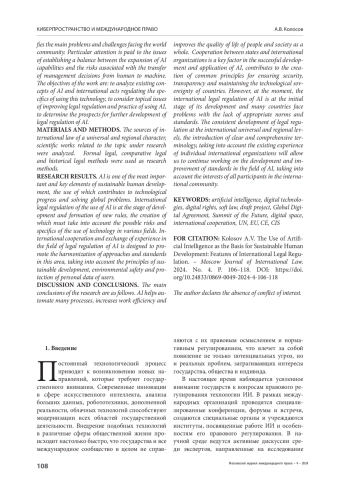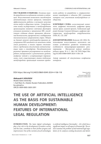 РЕЗУЛЬТАТЫ ИССЛЕДОВАНИЯ. Искусственный интеллект является одним из наиболее важных и ключевых элементов устойчивого развития человечества, использование которого способствует техническому прогрессу и решению глобальных проблем. Международно-правовое регулирование использования ИИ находится на стадии разработки и формирования новых правил, при создании которых необходимо учитывать возможные риски и специфику применения технологии в различных сферах. Международное сотрудничество и обмен опытом в области правового регулирования ИИ призваны способствовать гармонизации подходов и стандартов в этой сфере с учетом принципов устойчивого развития, экологической безопасности и защиты персональных данных пользователей.