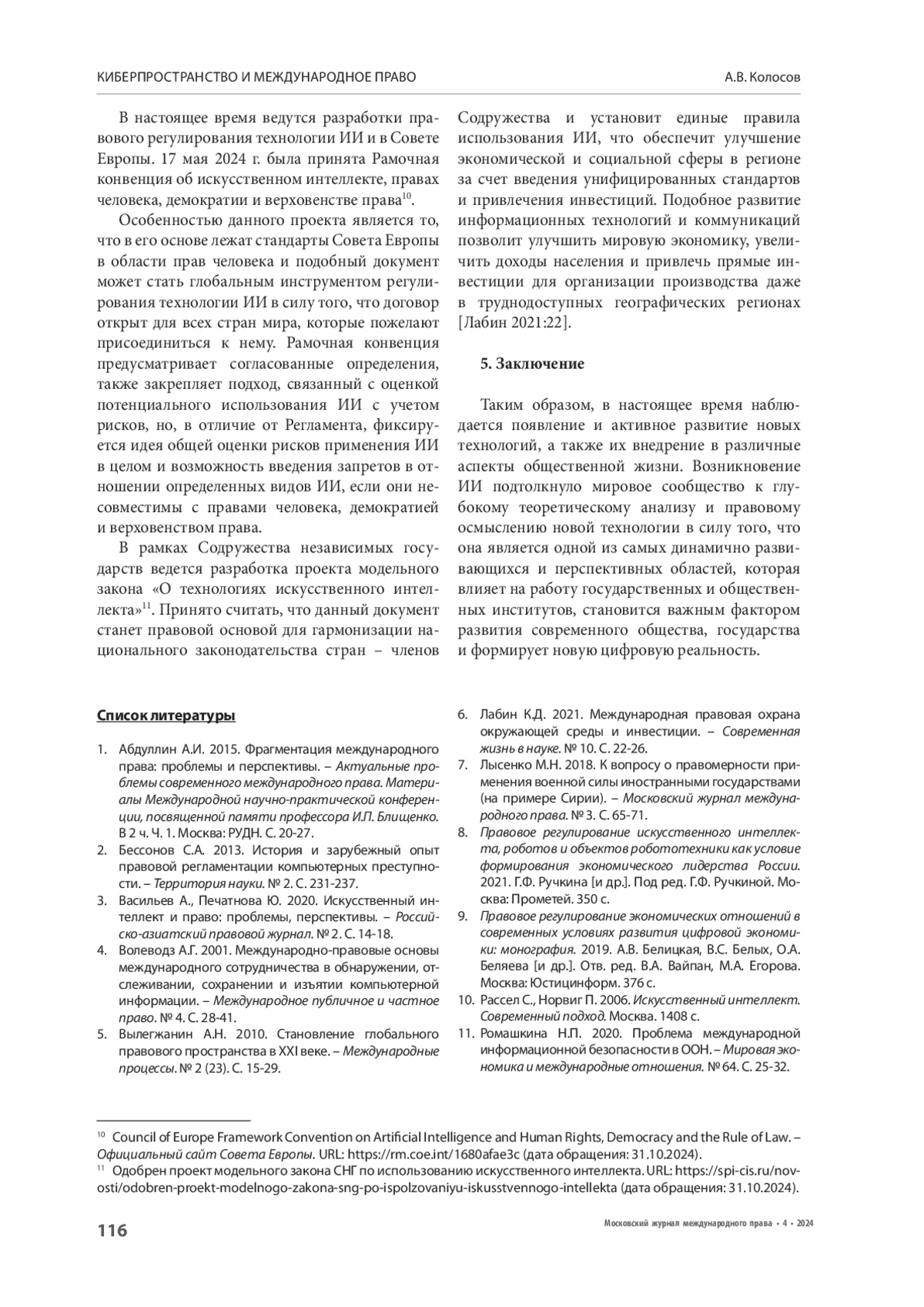 5. Вылегжанин А.Н. 2010. Становление глобального правового пространства в ХХI веке. - Международные процессы. № 2 (23). С. 15-29.