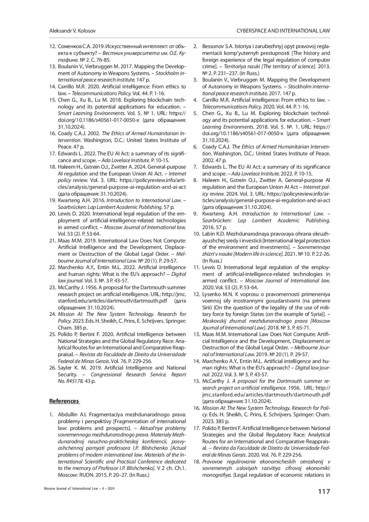 20. Lewis D. 2020. International legal regulation of the employment of artificial-intelligence-related technologies in armed conflict. - Moscow Journal of International law. Vol. 53 (2). P. 53-64.