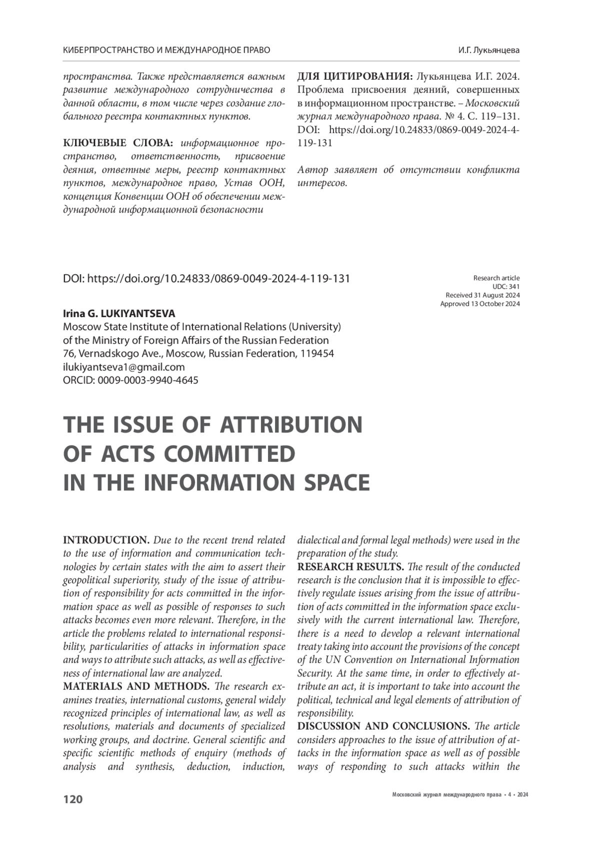 ВВЕДЕНИЕ. В основе настоящего исследования лежит проблема присвоения ответственности за деяния, совершенные в информационном пространстве. Ее актуальность обуславливается наметившейся в последнее время тенденцией, заключающейся в применении отдельными государствами информационно-коммуникационных технологий (далее – ИКТ) для утверждения своего геополитического превосходства. Вместе с тем остаются открытыми как вопрос присвоения подобных распространенных деяний, так и вопрос дальнейшего реагирования на них. В связи с этим в статье анализируются теоретические аспекты международно-правовой ответственности, в том числе вопросы единообразного применения соответствующей терминологии, особенности присвоения деяния в информационном пространстве. Также рассматривается вопрос эффективности международно-правового регулирования указанной тематики.