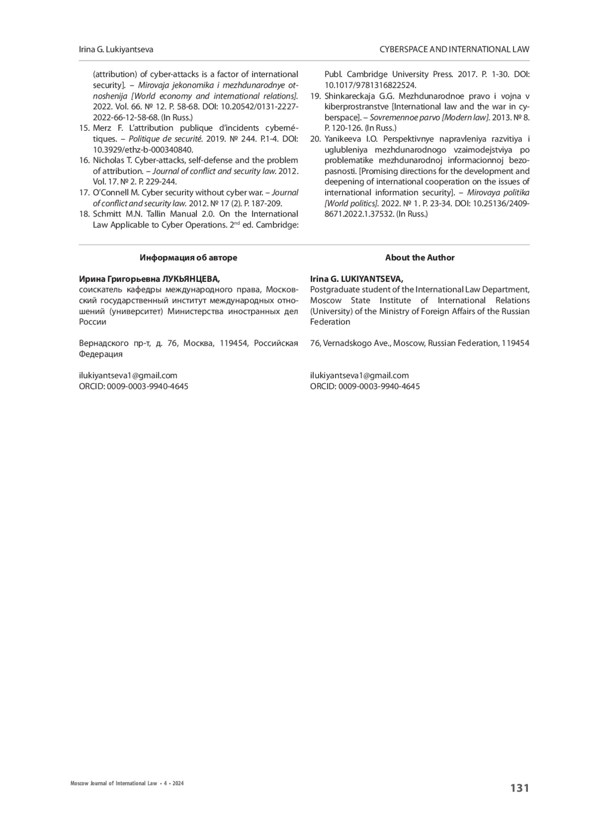 1. Гаркуша-Божко С.Ю. 2021. Международное гуманитарное право в киберпространстве: Ratione materiae, ratione temporis и проблема квалификации кибератак. - Цифровое право. Т. 2. № 1. С. 64-82. https://doi.org/10.38044/2686-9136-2021-2-1-64-82