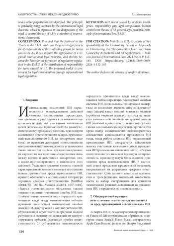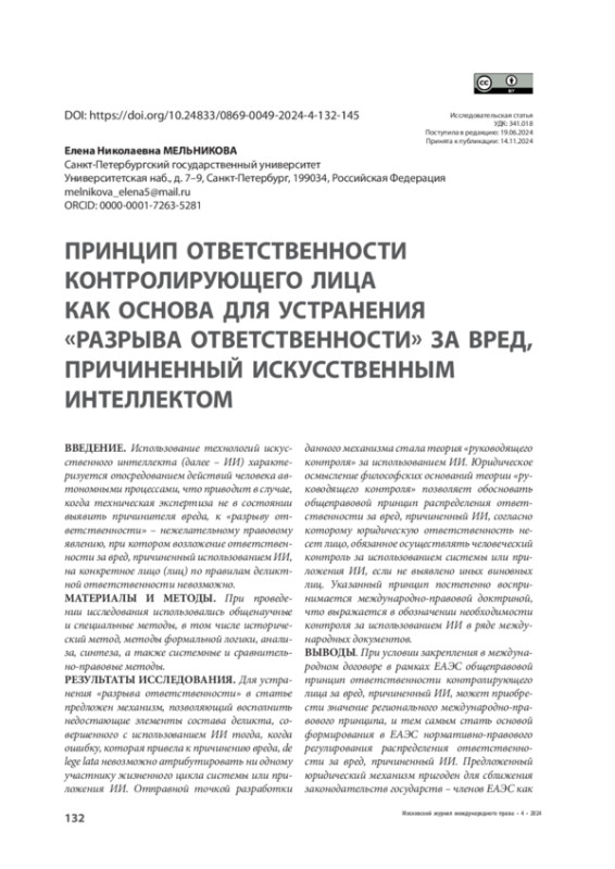 ВЫВОДЫ. При условии закрепления в международном договоре в рамках ЕАЭС общеправовой принцип ответственности контролирующего лица за вред, причиненный ИИ, может приобрести значение регионального международно-правового принципа, и тем самым стать основой формирования в ЕАЭС нормативно-правового регулирования распределения ответственности за вред, причиненный ИИ. Предложенный юридический механизм пригоден для сближения законодательств государств – членов ЕАЭС как посредством наднационального правового регулирования, так и посредством гармонизации законодательств по данному вопросу.