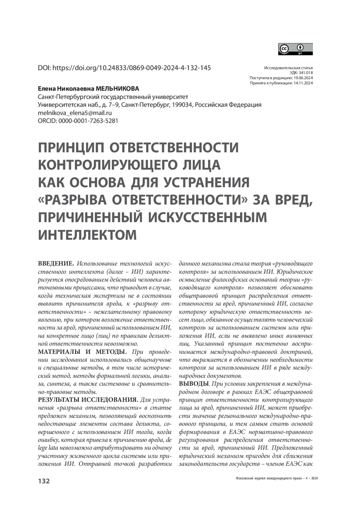 РЕЗУЛЬТАТЫ ИССЛЕДОВАНИЯ. Для устранения «разрыва ответственности» в статье предложен механизм, позволяющий восполнить недостающие элементы состава деликта, совершенного с использованием ИИ тогда, когда ошибку, которая привела к причинению вреда, de lege lata невозможно атрибутировать ни одному участнику жизненного цикла системы или приложения ИИ. Отправной точкой разработки данного механизма стала теория «руководящего контроля» за использованием ИИ. Юридическое осмысление философских оснований теории «руководящего контроля» позволяет обосновать общеправовой принцип распределения ответственности за вред, причиненный ИИ, согласно которому юридическую ответственность несет лицо, обязанное осуществлять человеческий контроль за использованием системы или приложения ИИ, если не выявлено иных виновных лиц. Указанный принцип постепенно воспринимается международно-правовой доктриной, что выражается в обозначении необходимости контроля за использованием ИИ в ряде международных документов.