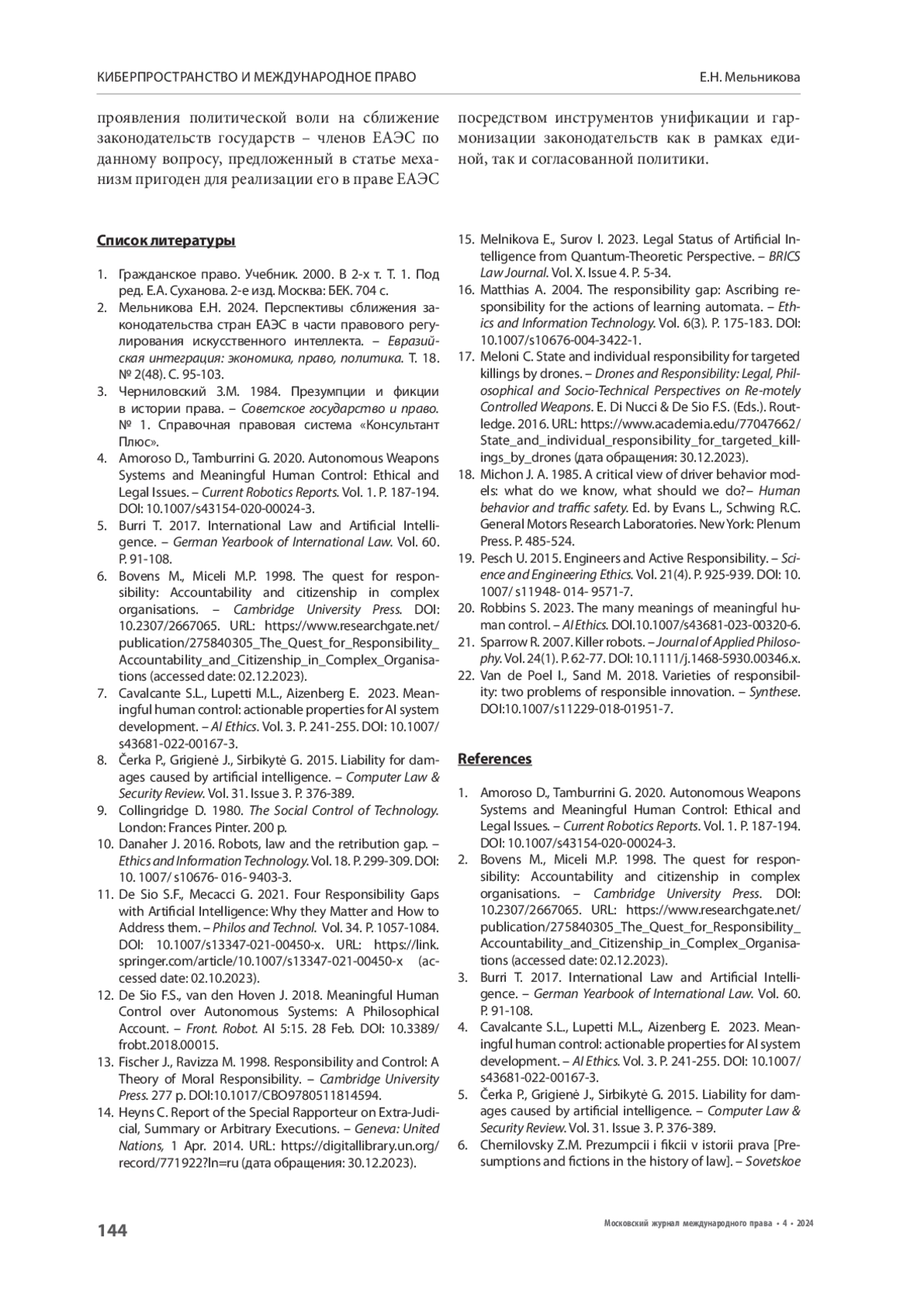 4. Amoroso D., Tamburrini G. 2020. Autonomous Weapons Systems and Meaningful Human Control: Ethical and Legal Issues. - Current Robotics Reports. Vol. 1. Р. 187-194. https://doi.org/10.1007/s43154-020-00024-3.