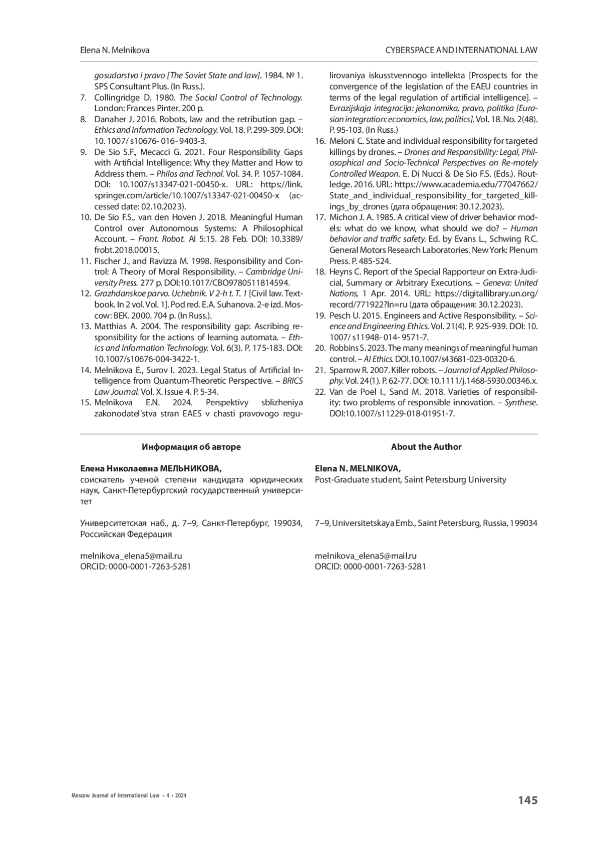 16. Matthias A. 2004. The responsibility gap: Ascribing responsibility for the actions of learning automata. - Ethics and Information Technology. Vol. 6(3). Р. 175-183. https://doi.org/10.1007/s10676-004-3422-1.
