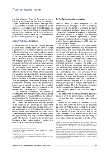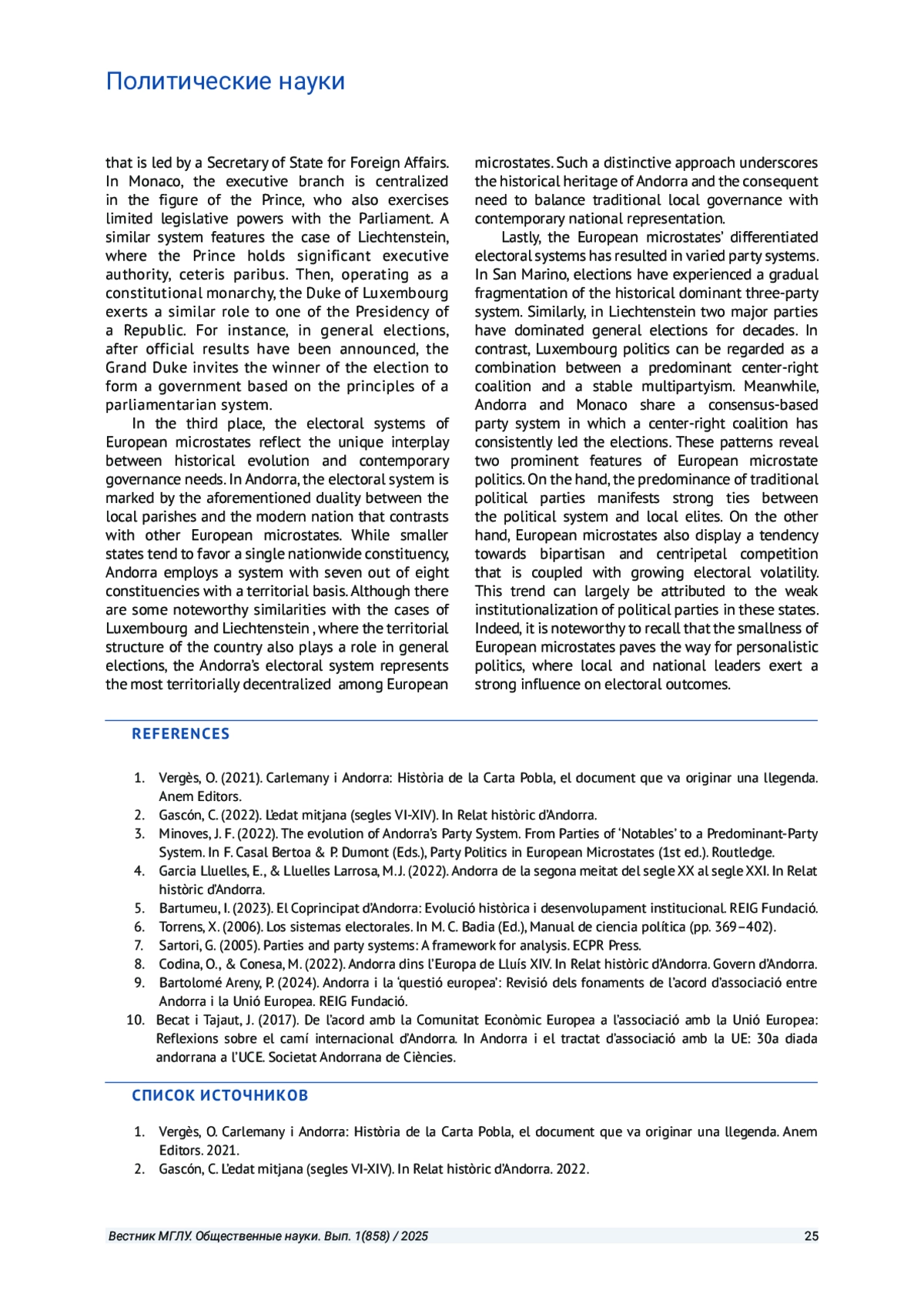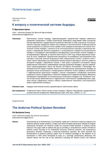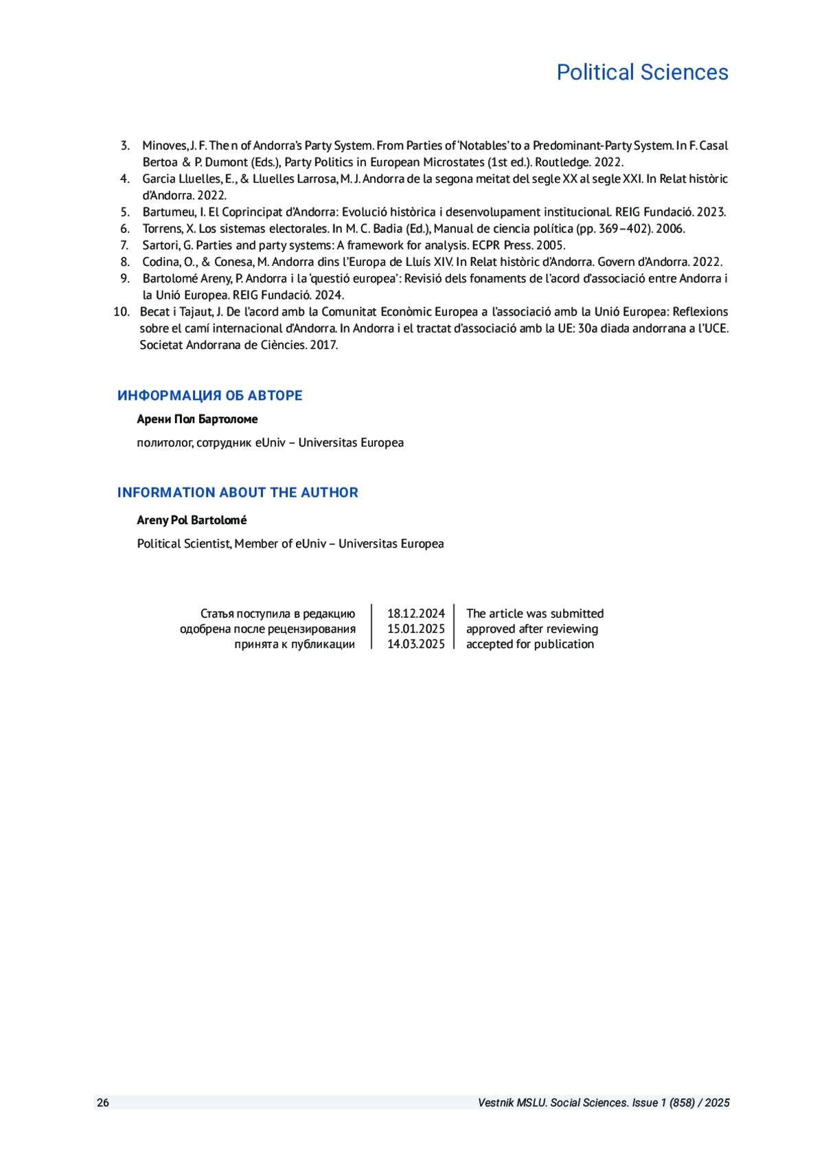 БАРТОЛОМЕ А. П. К ВОПРОСУ О ПОЛИТИЧЕСКОЙ СИСТЕМЕ АНДОРРЫ // ВЕСТНИК МОСКОВСКОГО ГОСУДАРСТВЕННОГО ЛИНГВИСТИЧЕСКОГО УНИВЕРСИТЕТА. ОБЩЕСТВЕННЫЕ НАУКИ. 2025. № 1 (858)