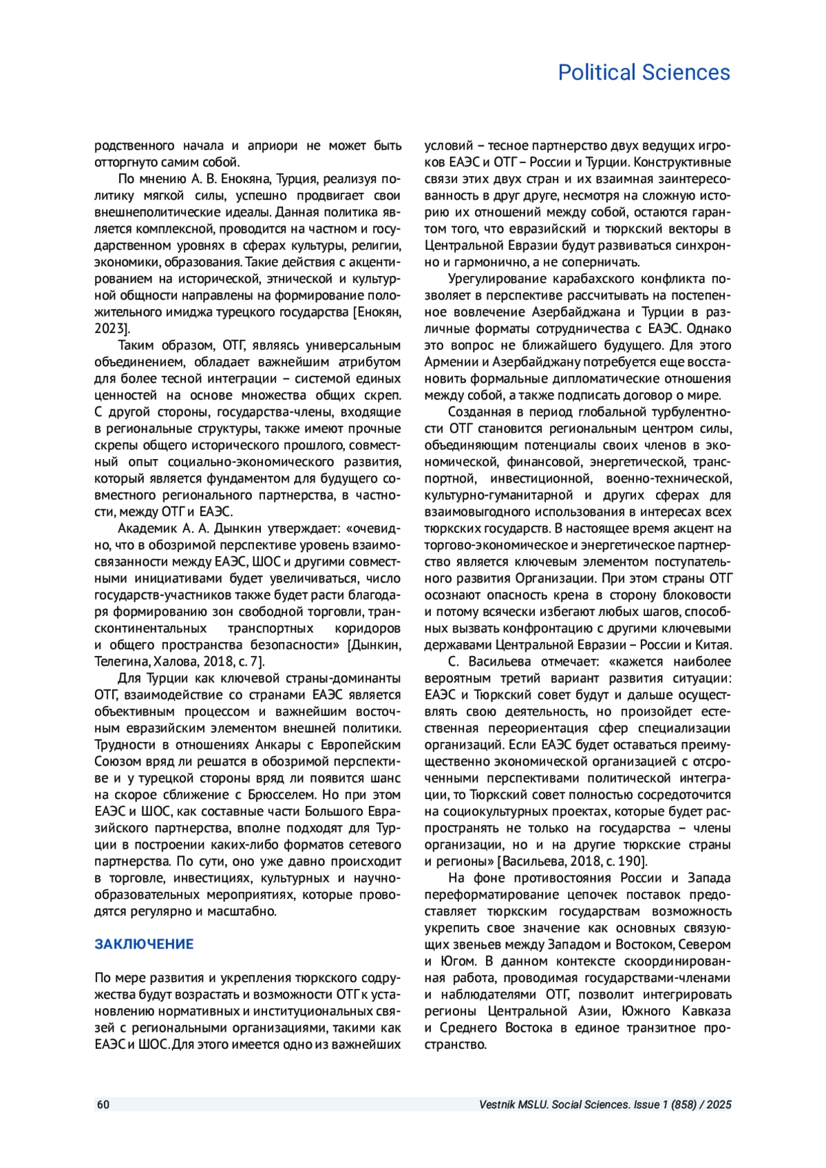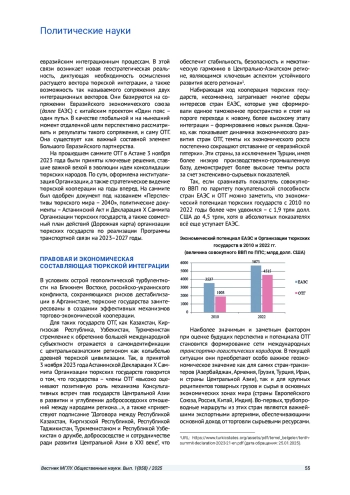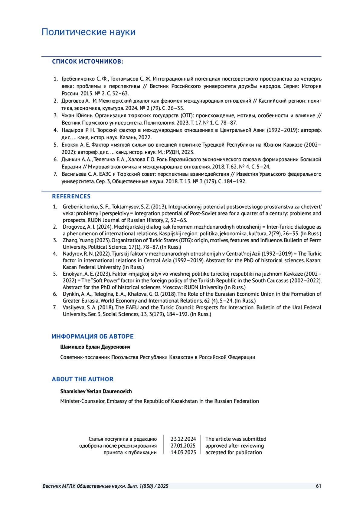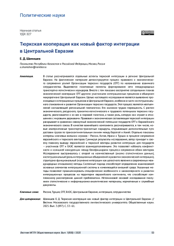 ШАМИШЕВ Е. Д. ТЮРКСКАЯ КООПЕРАЦИЯ КАК НОВЫЙ ФАКТОР ИНТЕГРАЦИИ В ЦЕНТРАЛЬНОЙ АЗИИ // ВЕСТНИК МОСКОВСКОГО ГОСУДАРСТВЕННОГО ЛИНГВИСТИЧЕСКОГО УНИВЕРСИТЕТА. ОБЩЕСТВЕННЫЕ НАУКИ. 2025. № 1 (858)