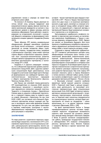 В статье рассматриваются отдельные аспекты тюркской интеграции в регионе Центральной Евразии. На фактическом материале демонстрируется процесс правового и экономического сопряжения усилий Организации тюркских государств (ОТГ) по налаживанию взаимного сотрудничества. Выделяются позитивные моменты формирования сети международных транспортно-логистических коридоров. Вместе с тем показано восприятие сегодняшних планов экономической кооперации ОТГ другими участниками интеграционных процессов в обширном макрорегионе Центральной Евразии. Целью настоящего исследования является выявление происходящих интеграционных процессов в Центральной Евразии, особенно в части институционального становления и развития Организации тюркских государств. Этот процесс является неотъемлемой составляющей региональной геополитики. Его значение трудно переоценить. С ростом экономического, ресурсного, транзитно-логистического и трудового потенциала тюркских государств, увеличивается и их вес в мировой политике, а также роль, которую они играют в отношениях с мировыми державами. Правовая и экономическая составляющая тюркской интеграции раскрывают в сравнении совокупный экономический потенциал государств ОТГ и Евразийского экономического союза. В качестве важнейшего компонента рассматриваются, в том числе, новые альтернативные транспортно-транзитные маршруты, открывающие дополнительные пути доставки грузов по трансконтинентальным линиям между Европой и Азией. Отдельно показаны интересы ключевых внешних игроков - России, Китая, Ирана и Турции в процессе сопряжения евразийского и тюркского векторов. Суммируя результаты исследования, автор приходит к своему главному выводу: евразийский и тюркский векторы развития интеграции для государств - участников ОТГ и ЕАЭС являются взаимодополняемыми. Это позволяет избежать конфликтности и излишней конкуренции между бенефициарами процесса сопряжения обоих векторов. Исследование выстраивалось с опорой на количественный (анализ статистических данных), институциональный (роль интеграционных объединений в развитии экономической интеграции), структурно-функциональный (изучение интеграции как целостного явления в современных международных отношениях) методы. Системный подход способствует определению взаимосвязей основных элементов интеграционной системы в изменяющейся внешней среде. Указанные методы позволяют проанализировать специфические особенности и закономерности в развитии интеграционных процессов на территории евразийского континента, что способствует комплексному рассмотрению данной проблематики. Источниковой основой исследования послужили статистические и информационно-аналитические материалы, нормативные и служебные документы.