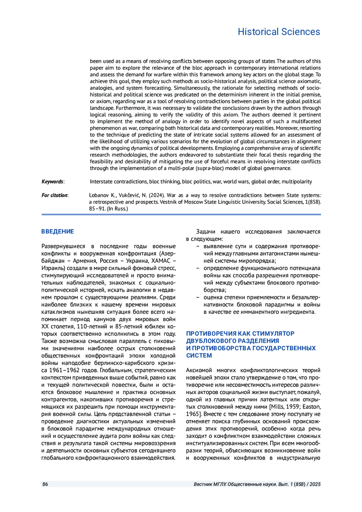 Новейшая история мира отмечена противоречивым взаимодействием двух глобальных трендов - интеграции, выражавшейся в консолидации государств в системы блоков, и дезинтеграции, сопровождавшейся распадом этих систем вследствие межблоковых конфронтаций. Способом разрешения противоречий между конфликтующими комплексами государств, как правило, выступала война. В настоящей статье авторы поставили перед собой цель выявить актуальность блокового подхода в современных международных отношениях и определить уровень спроса у акторов мировой политики на войну в рамках такой парадигмы. Для достижения поставленной цели авторы применили методы социо-исторической и политологической аксиоматики, аналогий и прогнозирования состояния систем. Целесообразность выбора методов социо-исторической и политологической аксиоматики была продиктована детерминированностью исходного утверждения (аксиомы) о войне как одном из инструментов разрешения противоречий между субъектами мировой политики. Логические рассуждения авторов направлены на верификацию данной аксиомы. Апелляция к методу прогнозирования состояния сложных социальных систем позволила оценить вероятность реализации ряда сценарных планов развития мировой ситуации в соответствии с текущей динамикой политических событий. При помощи суммы избранных методов научного исследования авторы осуществили попытку обосновать свой главный вывод о желательности и возможности редуцирования насильственно-вооруженного способа разрешения межгосударственных противоречий в рамках утверждения мультиполярной (надблоковой) модели мироустройства.