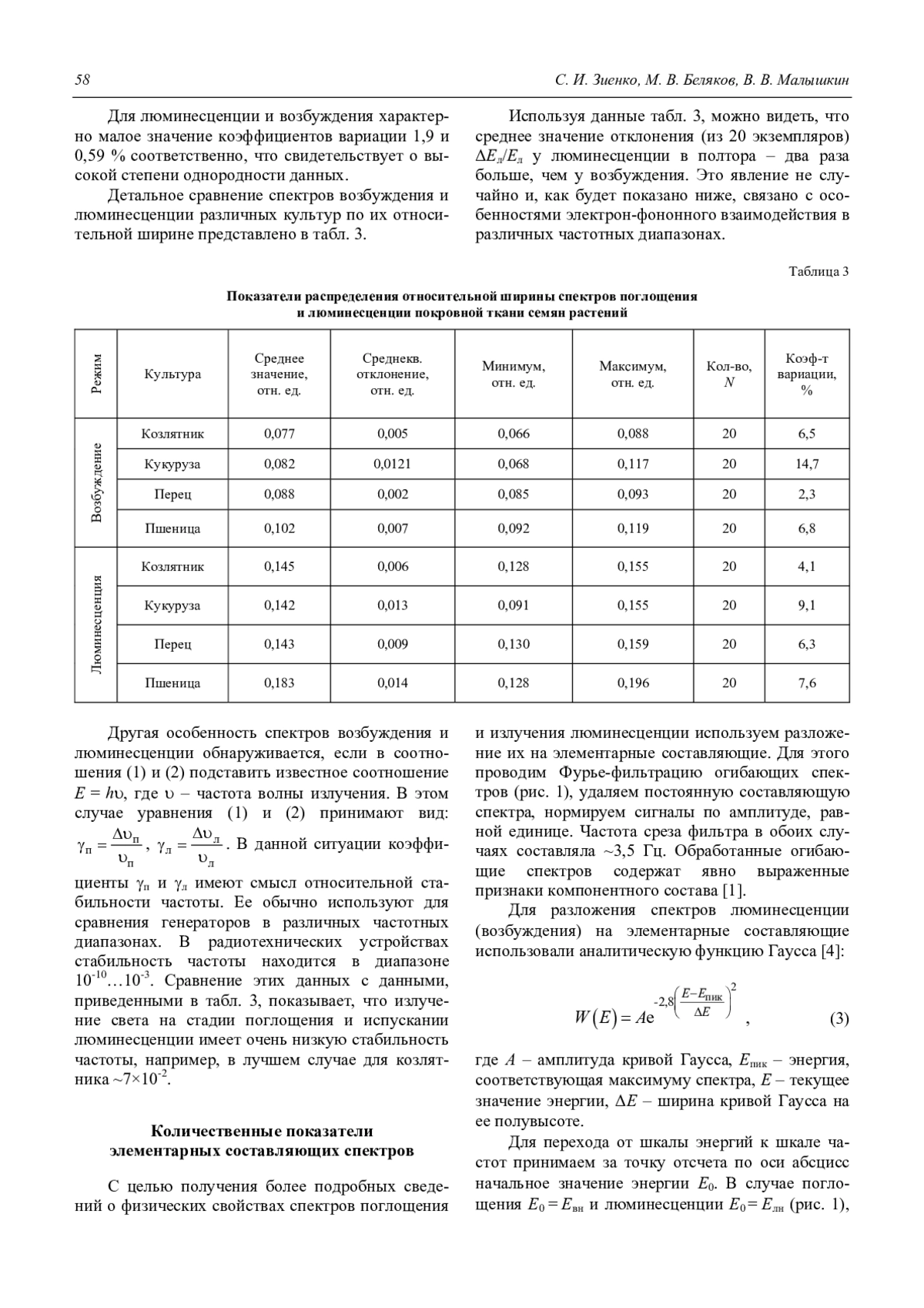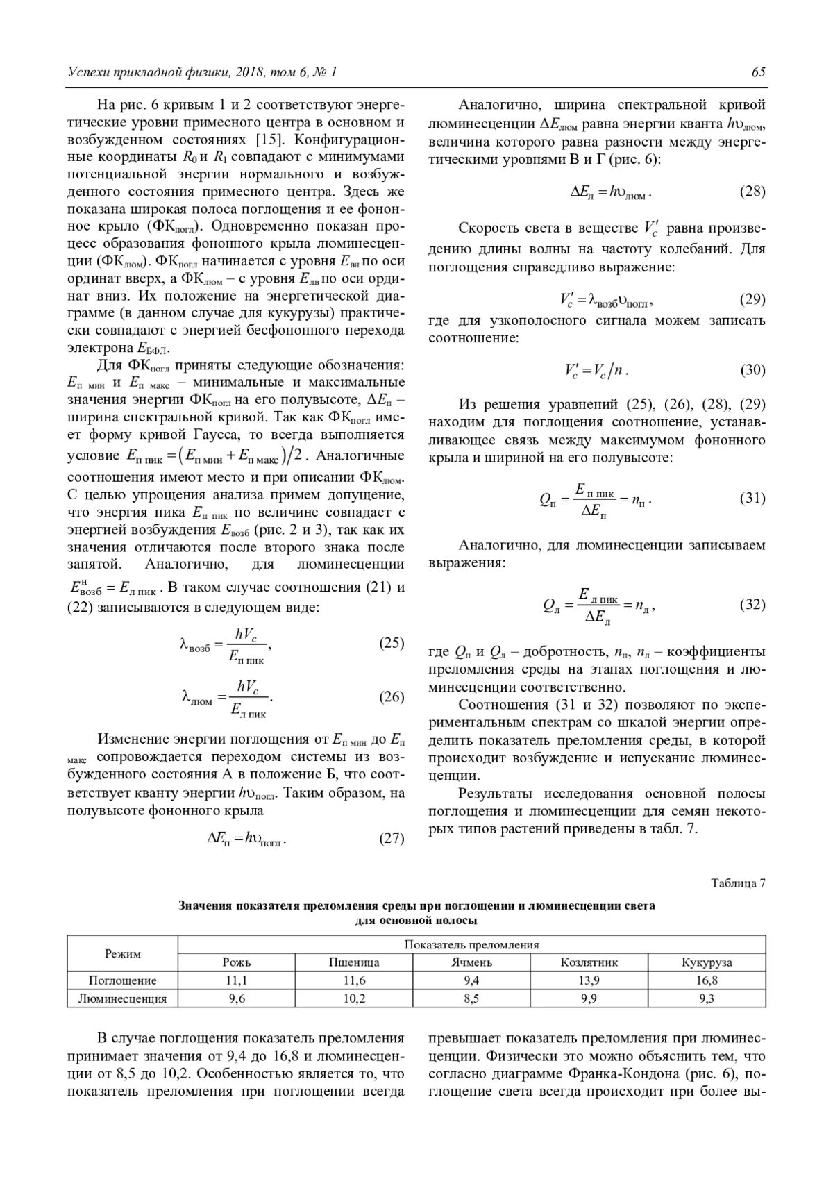 Статья посвящена комплексному исследованию диэлектрических свойств покровной ткани семян растений на стадиях возбуждения и испускания люминесценции: кукурузы, пшеницы, ячменя, перца и козлятника. Экспериментально установлена относительно низкая стабильность спектров возбуждения и испускания люминесценции по их относительной ширине, которая в лучшем случае для козлятника составляет, примерно, 0,077. Обнаружено существование между модулем и мнимой частью комплексного спектра на пиковой частоте угла задержки, величина которого определяется временем максвелловской релаксации. Предложена электрическая схема полосового RC-фильтра, отражающего свойства среды на этапах возбуждения и испускания люминесценции. Показана возможность определения показателя преломления среды по величине добротности спектра по шкале энергии. Обработка данных эксперимента выполнена с использованием математического пакета Microcal Origin (7 версия).