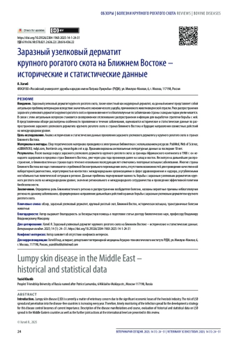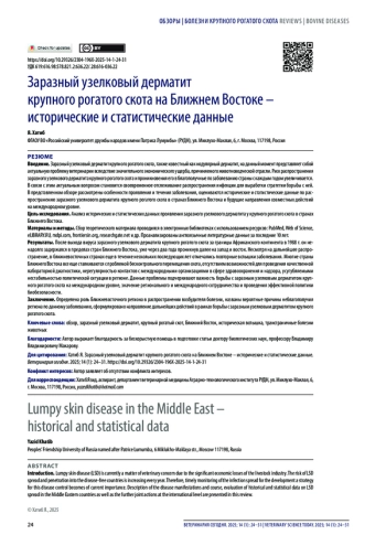 Введение. Заразный узелковый дерматит крупного рогатого скота, также известный как нодулярный дерматит, на данный момент представляет собой актуальную проблему ветеринарии вследствие значительного экономического ущерба, причиняемого животноводческой отрасли. Риск распространения заразного узелкового дерматита крупного рогатого скота и проникновения его в благополучные по заболеванию страны с каждым годом увеличивается. В связи с этим актуальным вопросом становится своевременное отслеживание распространения инфекции для выработки стратегии борьбы с ней. В представленном обзоре рассмотрены особенности проявления и течения заболевания, оцениваются исторические и статистические данные по распространению заразного узелкового дерматита крупного рогатого скота в странах Ближнего Востока и будущие направления совместных действий на международном уровне.