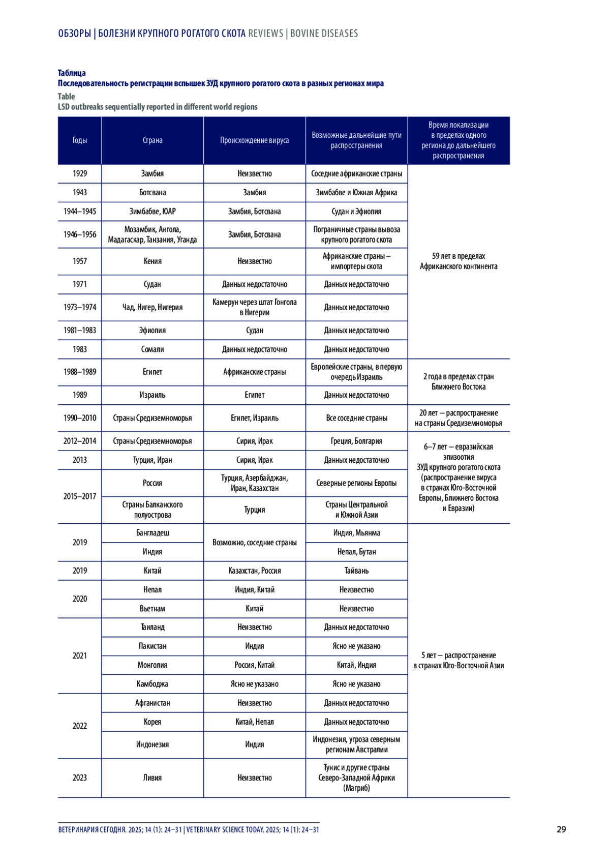 Результаты. После выхода вируса заразного узелкового дерматита крупного рогатого скота за границы Африканского континента в 1988 г. он ненадолго задержался в пределах стран Ближнего Востока, уже через два года проникнув далее на запад и восток. Несмотря на дальнейшее распространение, в ближневосточных странах еще в течение нескольких последующих лет отмечались повторные вспышки заболевания. Многие страны Ближнего Востока все еще сталкиваются с проблемой бесконтрольного перемещения скота, отсутствием возможностей для проведения качественной лабораторной диагностики, нерегулярностью контактов с международными организациями в сфере здравоохранения и надзора, усугубляемыми нестабильностью политической ситуации в регионе. Данные проблемы подчеркивают важность борьбы с заразным узелковым дерматитом крупного рогатого скота на международном уровне, значение регионального и международного сотрудничества и проведения эффективной политики биобезопасности.