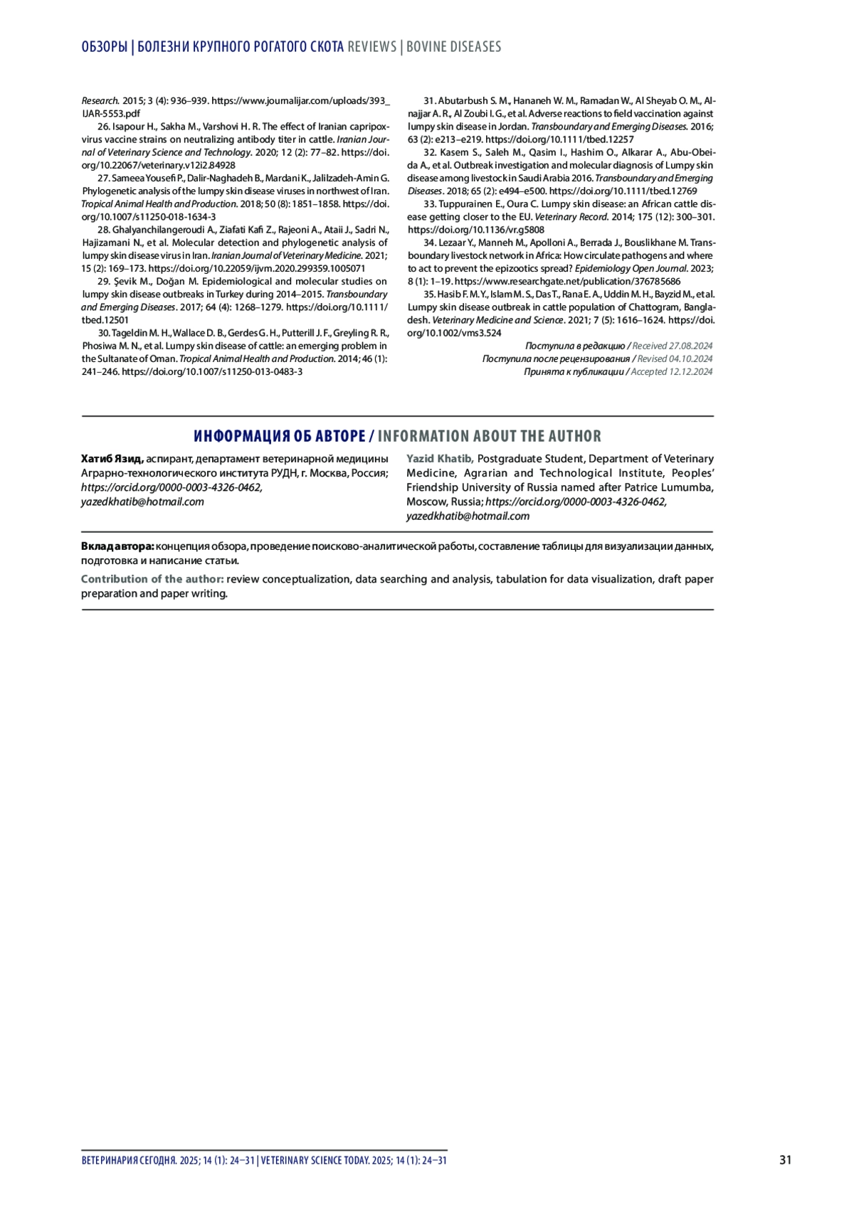 25. Jarullah B. A. Incidence of lumpy skin disease among Iraqi cattle in Waset Governorate, Iraq Republic.International Journal of Advanced Research. 2015; 3 (4): 936-939. https://www.journalijar.com/uploads/393_IJAR-5553.pdf.