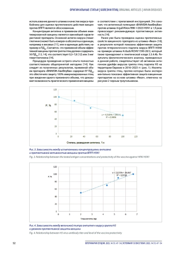 Результаты. Установили, что птицы, привитые цельной дозой антигена, были полностью защищены от клинического проявления болезни после контрольного заражения. Уменьшение концентрации антигена в прививном объеме обусловило снижение протективной защиты вакцины. Показатель смертности после заражения контрольных (интактных) цыплят составил 10/10. Анализ зависимости протективной активности вакцины от величины иммунизирующей дозы антигена показал, что одна прививная доза содержала 97 ПД50. Исследование связи протективной защиты и напряженности поствакцинального гуморального иммунитета позволило определить, что ожидаемый среднегрупповой титр антител, который соответствует защите 90% вакцинированных птиц, составил 5,7 log2, или ≈ 1:52.