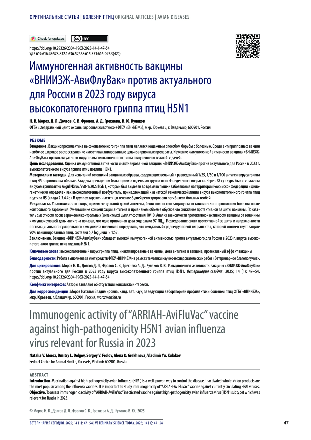 Заключение. Вакцина «ВНИИЗЖ-АвиФлуВак» обладает высокой иммуногенной активностью против актуального для России в 2023 г. вируса высокопатогенного гриппа птиц подтипа H5N1.
