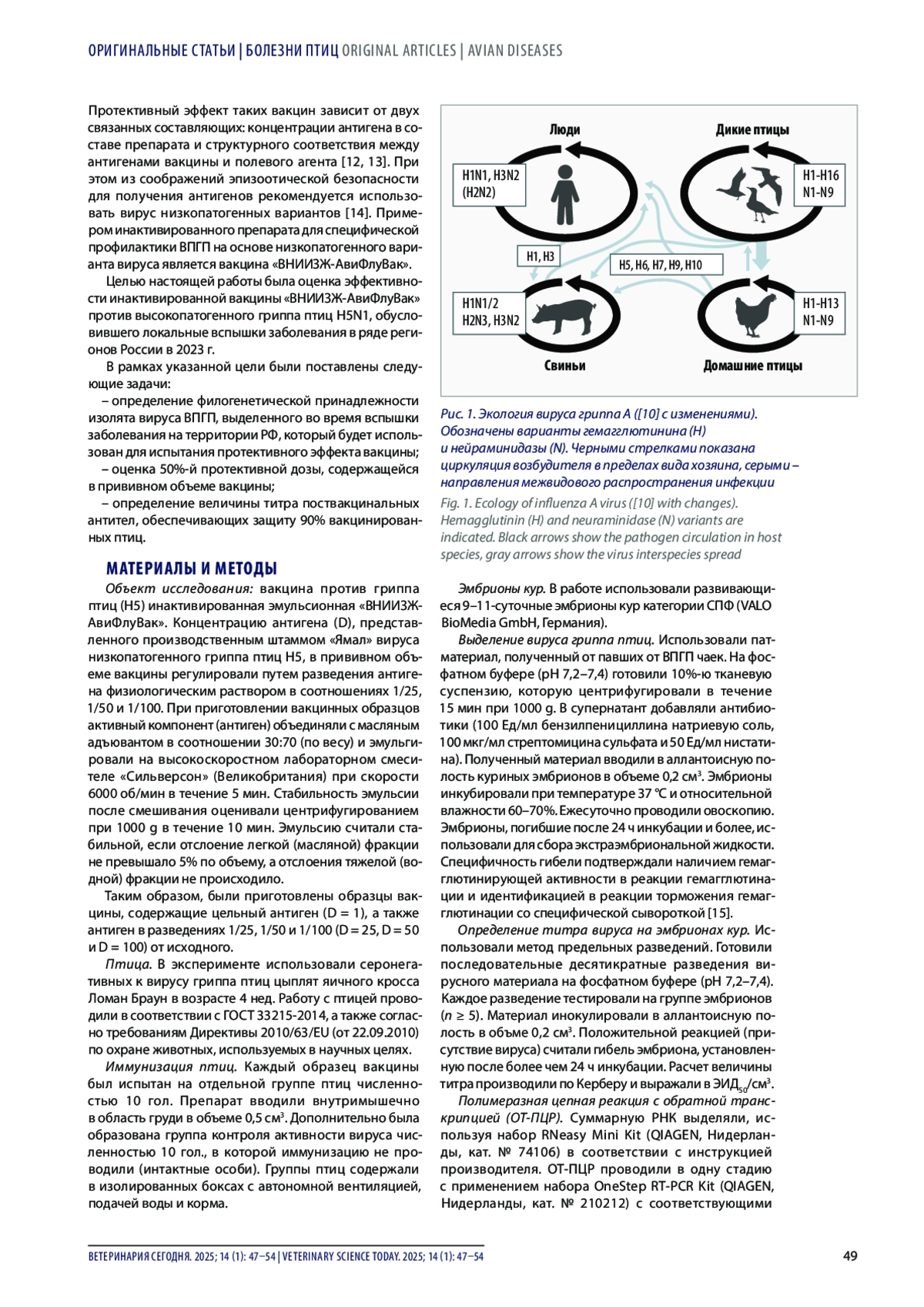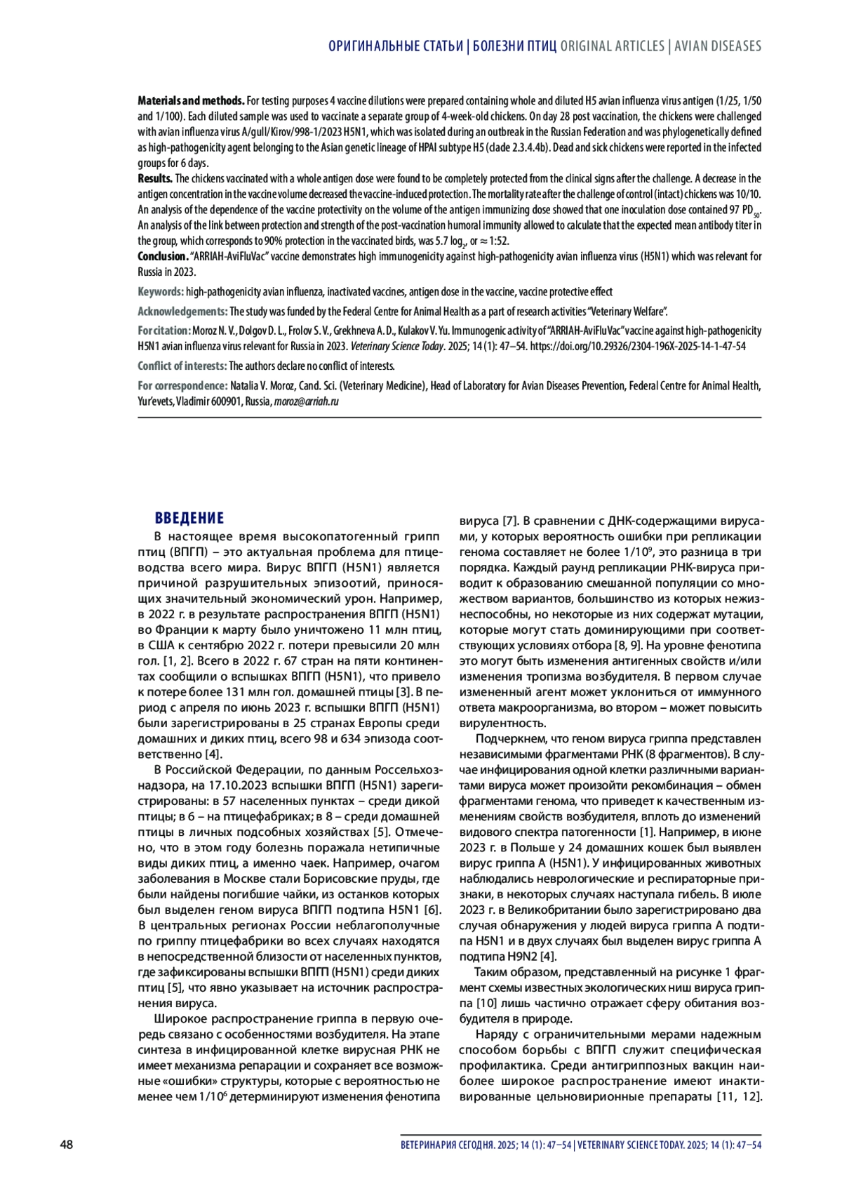 В настоящее время высокопатогенный грипп птиц (ВПГП) – это актуальная проблема для птицеводства всего мира. Вирус ВПГП (H5N1) является причиной разрушительных эпизоотий, приносящих значительный экономический урон. Например, в 2022 г. в результате распространения ВПГП (H5N1) во Франции к марту было уничтожено 11 млн птиц, в США к сентябрю 2022 г. потери превысили 20 млн гол. [1, 2]. Всего в 2022 г. 67 стран на пяти континентах сообщили о вспышках ВПГП (H5N1), что привело к потере более 131 млн гол. домашней птицы [3]. В период с апреля по июнь 2023 г. вспышки ВПГП (H5N1) были зарегистрированы в 25 странах Европы среди домашних и диких птиц, всего 98 и 634 эпизода соответственно [4].