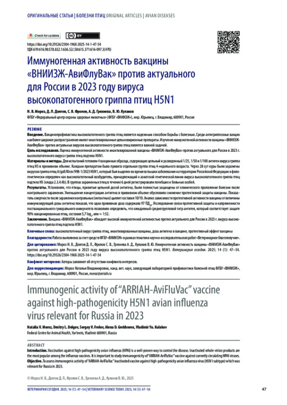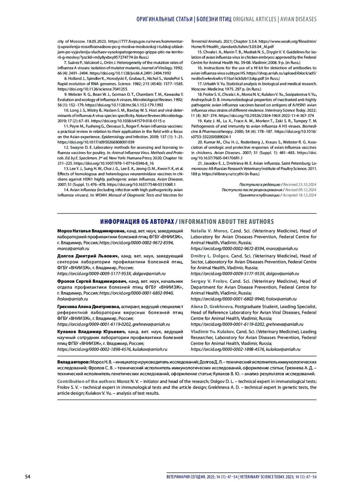 18. Фролов С. В., Чвала И. А., Мороз Н. В., Кулаков В. Ю., Сосипаторова В. Ю., Андрейчук Д. Б. Иммунобиологические свойства инактивированных вакцин против высокопатогенного гриппа птиц, изготовленных на основе антигенов штаммов вируса гриппа подтипа А/Н5Ж различной вирулентности. Ветеринария сегодня. 2022; 11 (4): 367-374. DOI: 10.29326/2304-196X-2022-11-4-367-374