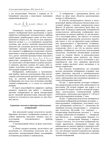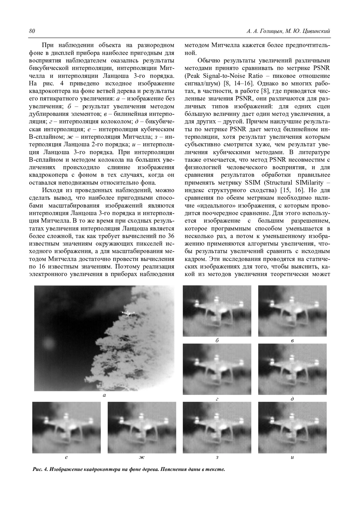 В работе проведен практический анализ различных способов сглаживания изображений при их электронном увеличении. Проведено визуальное сравнение тепловизионных изображений реального объекта (квадракоптера), увеличенных различными описанными способами. Наилучшие результаты дают метод Митчелла и метод Ланцоша 3-го порядка, но так как при визуально одинаковых результатах интерполяции реализация методом Митчелла более простая, то этот способ увеличения изображения представляется более предпочтительным.