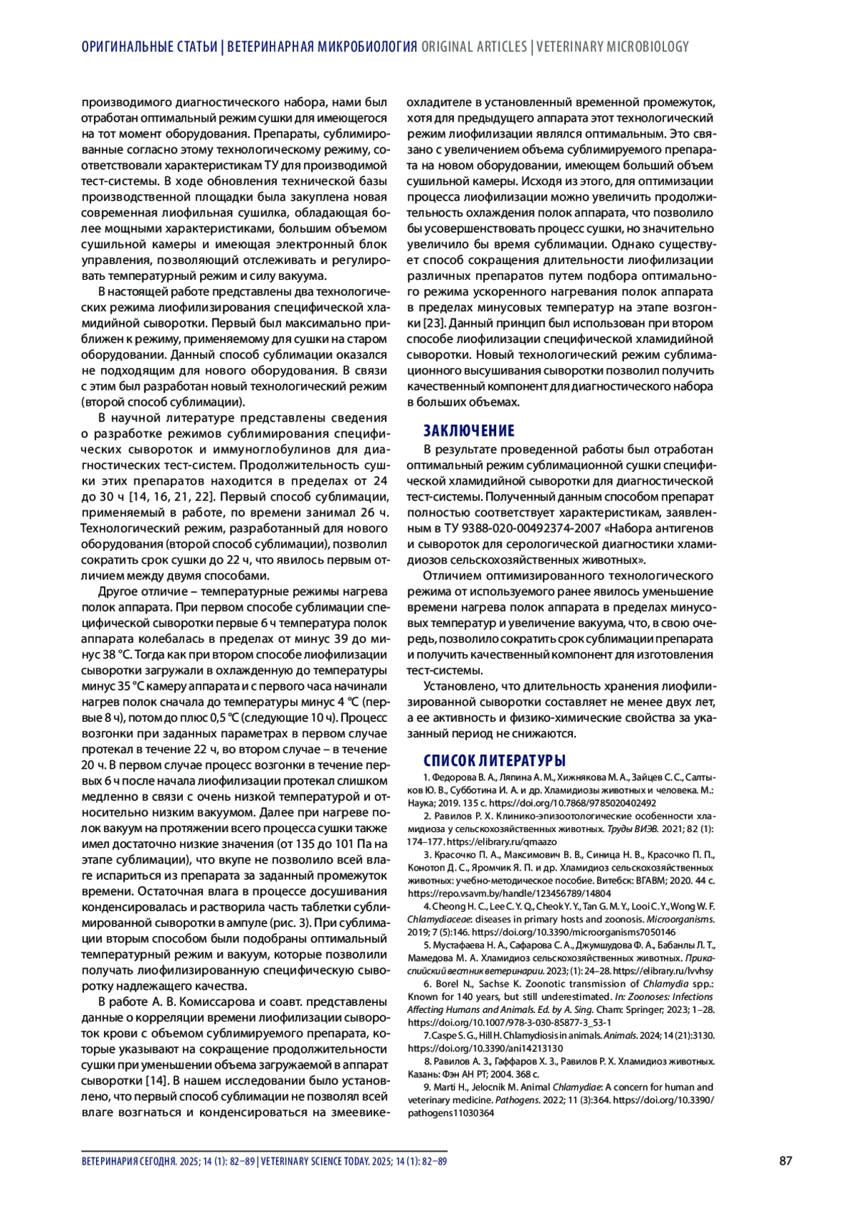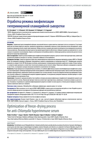 Заключение. В результате проведенной работы был отработан оптимальный режим лиофилизации специфической хламидийной сыворотки для диагностической тест-системы. Полученный препарат полностью соответствует характеристикам, заявленным в технических условиях на диагностикум. Установлено, что длительность хранения лиофилизированной сыворотки составляет не менее двух лет, в течение данного периода ее активность и физико-химические свойства не снижаются.