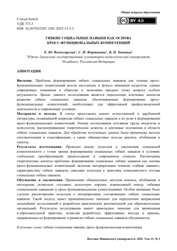 Материалы и методы. В статье представлен анализ отечественной и зарубежной литературы, посвящённой вопросам гибких социальных навыков и их роли в формировании кросс-функциональных компетенций. Основу исследования составили труды педагогов и психологов, рассматривающие теоретические аспекты и ключевые положения в области гибких социальных навыков. Для обработки полученных данных были применены методы систематизации и классификации, а также общенаучные методы анализа, обобщения и синтеза.