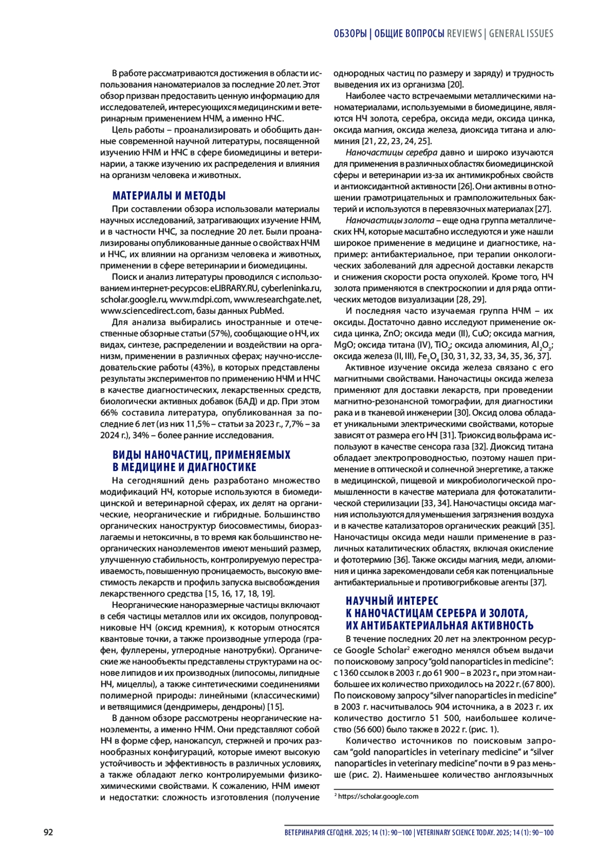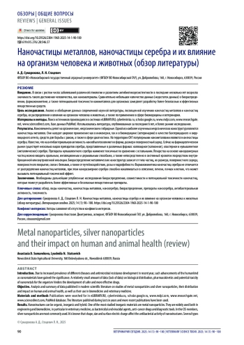 Введение. В связи с ростом числа заболеваний различной этиологии и развитием антибиотикорезистентности в последние несколько лет возросла значимость такого достижения человечества, как наноматериалы. Cравнительно небольшое количество данных (недостаток данных) о биораспределении, фармакокинетике, а также потенциальной токсичности нанометаллов для организма замедляет разработку более безопасных и эффективных лекарственных средств. Цель исследования. Анализ и обобщение данных современной научной литературы, посвященной изучению наночастиц металлов и наночастиц серебра, их распределения и влияния на организм человека и животных, а также по применению в сфере биомедицины и ветеринарии. Материалы и методы. Поиск источников производился в системах eLIBRARY. RU, cyberleninka. ru, scholar. google. ru, www. mdpi. com, www. researchgate. net, www. sciencedirect. com, базе данных PubMed. Использовалась литература, опубликованная за последние 6 лет, и более ранние исследования.