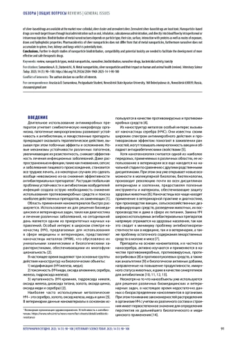Результаты. Наноэлементы делят на органические, неорганические и гибридные. Одной из наиболее изученных неорганических наноструктур являются наночастицы металлов. Они находят широкое применение как в инженерии, так и в биомедицине (ветеринарии) в качестве бактерицидного и вирулицидного агента, средств для борьбы с раком, а также в сфере диагностики. На территории СНГ популярными нанометаллами являются наночастицы серебра. Известно, что на антибактериальную активность нанообъектов влияют их форма, размер и поверхностный заряд. Сейчас на фармацевтическом рынке существует несколько видов препаратов серебра, представленные в различных формах: коллоидное (катионное), кластерное и нульвалентное (металлическое) серебро. Препараты нульвалентного серебра наименее токсичные по сравнению с остальными. Лекарства на основе наноразмерных частиц можно вводить оральным, ингаляционным и дермальным способами, а также непосредственно в системный кровоток посредством внутрибрюшинной или внутривенной инъекции. Биораспределение металлических наноструктур зависит от типа частиц, их размера, поверхностного заряда, поверхностного покрытия, связи с белками, а также от путей воздействия, дозы и гидрофобности. Фармакокинетика наночастиц серебра не отличается от распределения наночастиц металлов, при этом наноразмерное серебро способно накапливаться в селезенке, печени, почках и легких, что может вызывать потенциальный токсический эффект.