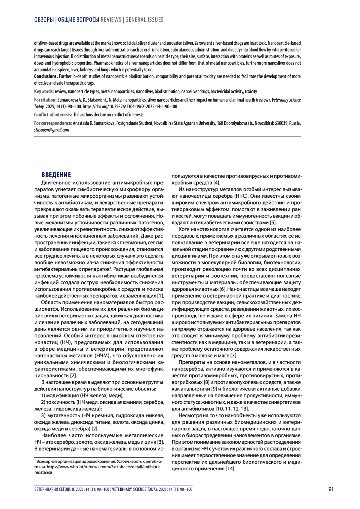 СУМАРОКОВА А. Д., СТАЦЕВИЧ Л. Н. НАНОЧАСТИЦЫ МЕТАЛЛОВ, НАНОЧАСТИЦЫ СЕРЕБРА И ИХ ВЛИЯНИЕ НА ОРГАНИЗМ ЧЕЛОВЕКА И ЖИВОТНЫХ (ОБЗОР ЛИТЕРАТУРЫ) // ВЕТЕРИНАРИЯ СЕГОДНЯ. 2025. № 1, ТОМ 14