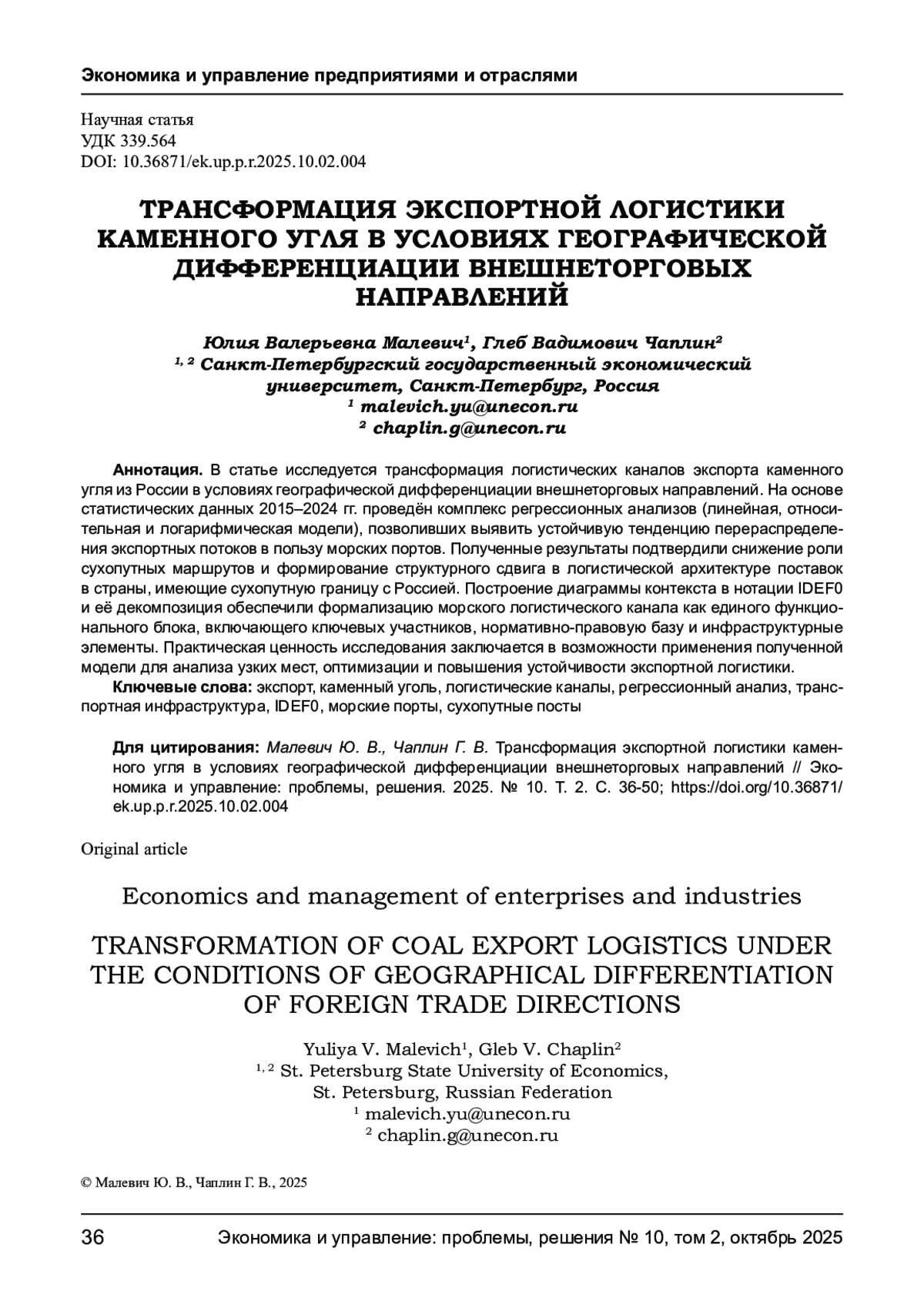 В статье исследуется трансформация логистических каналов экспорта каменного угля из России в условиях географической дифференциации внешнеторговых направлений. На основе статистических данных 2015-2024 гг. проведён комплекс регрессионных анализов (линейная, относительная и логарифмическая модели), позволивших выявить устойчивую тенденцию перераспределения экспортных потоков в пользу морских портов. Полученные результаты подтвердили снижение роли сухопутных маршрутов и формирование структурного сдвига в логистической архитектуре поставок в страны, имеющие сухопутную границу с Россией. Построение диаграммы контекста в нотации IDEF0 и её декомпозиция обеспечили формализацию морского логистического канала как единого функционального блока, включающего ключевых участников, нормативно-правовую базу и инфраструктурные элементы. Практическая ценность исследования заключается в возможности применения полученной модели для анализа узких мест, оптимизации и повышения устойчивости экспортной логистики.