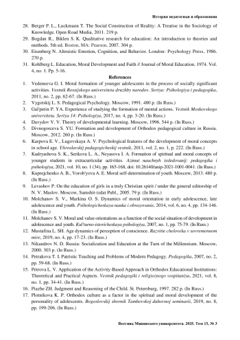 1. Веденеева Г. И. Нравственное формирование младших подростков в процессе социально значимой деятельности // Вестник Российского университета дружбы народов. Серия: Психология и педагогика. 2011. № 2. С. 62-67.