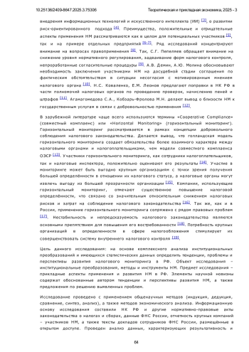 Налоговый мониторинг уже 10 лет развивается в Р Ф как особая форма налогового контроля за деятельностью крупнейших налогоплательщиков. Однако сейчас очевидно, что его роль как для государства, так и для бизнеса может быть существенно выше. Со временем институт налогового мониторинга (Н М) стал позиционироваться еще и как форма расширенного информационного взаимодействия налоговых органов и налогоплательщиков. В последние годы все чаще его связывают с развитием экономики данных и цифровой трансформацией. Анализ накопленного опыта и тенденций развития Н М имеет высокую актуальность для его совершенствования. О сознание проблем и перспектив развития необходимо для повышения эффективности его применения