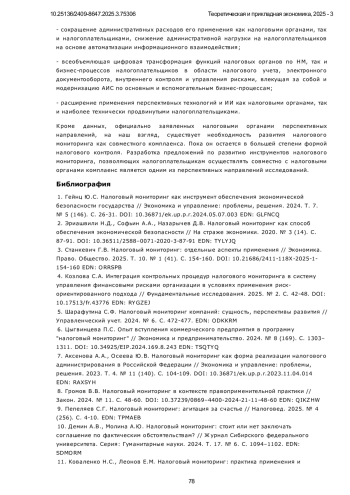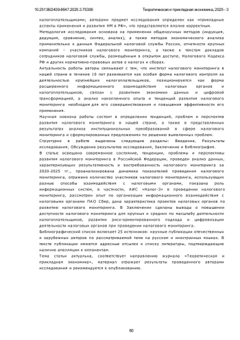 3. Станкевич Г.В. Налоговый мониторинг: отдельные аспекты применения // Экономика. Право. Общество. 2025. Т. 10. № 1 (41). С. 154-160. DOI: 10.21686/2411-118X-2025-1-154-160 EDN: ORRSPB
