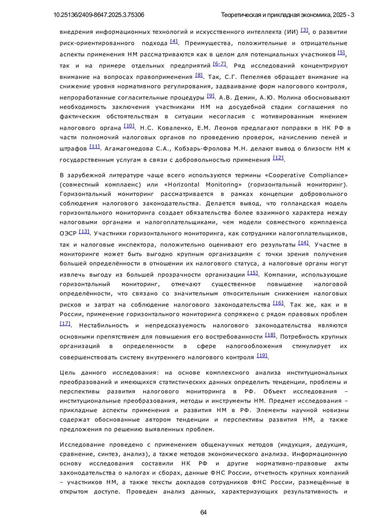 10. Демин А.В., Молина А.Ю. Налоговый мониторинг: стоит или нет заключать соглашение по фактическим обстоятельствам? // Журнал Сибирского федерального университета. Серия: Гуманитарные науки. 2024. Т. 17. № 6. С. 1094-1102. EDN: SDMORM