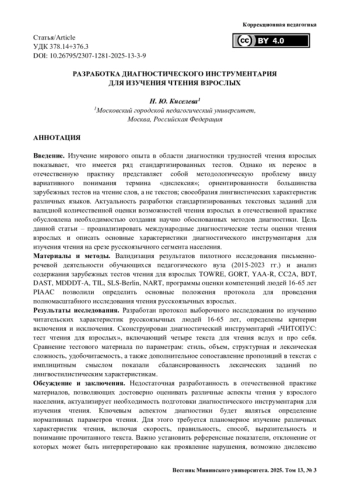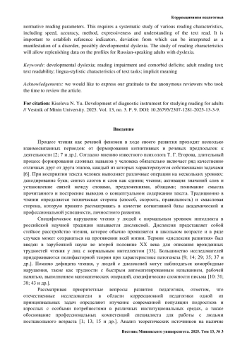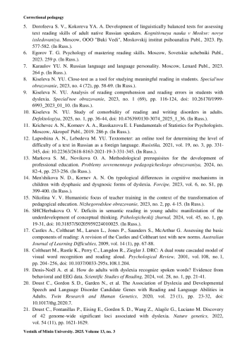 10. Киселева Н. Ю. Изучение коморбидности нарушений чтения и письма у взрослых // Дефектология. 2025. № 1. С. 36-44. https://doi.org/10.47639/0130-3074_2025_1_36.