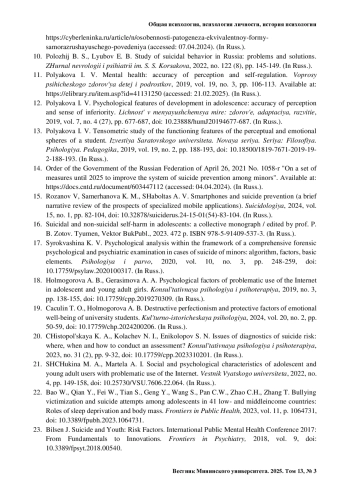 10. Положий Б. С., Любов Е. Б. Изучение суицидального поведения в России: проблемы и решения // Журнал неврологии и психиатрии им. С. С. Корсакова. 2022. № 122 (8). С. 145- 149.