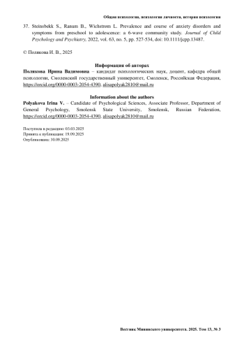 37. Steinsbekk S., Ranum B., Wichstrøm L. Prevalence and course of anxiety disorders and symptoms from preschool to adolescence: a 6-wave community study // Journal of Child Psychology and Psychiatry. 2022. Vol. 63, no. 5. Pp. 527-534. https://doi.org/10.1111/jcpp.13487.