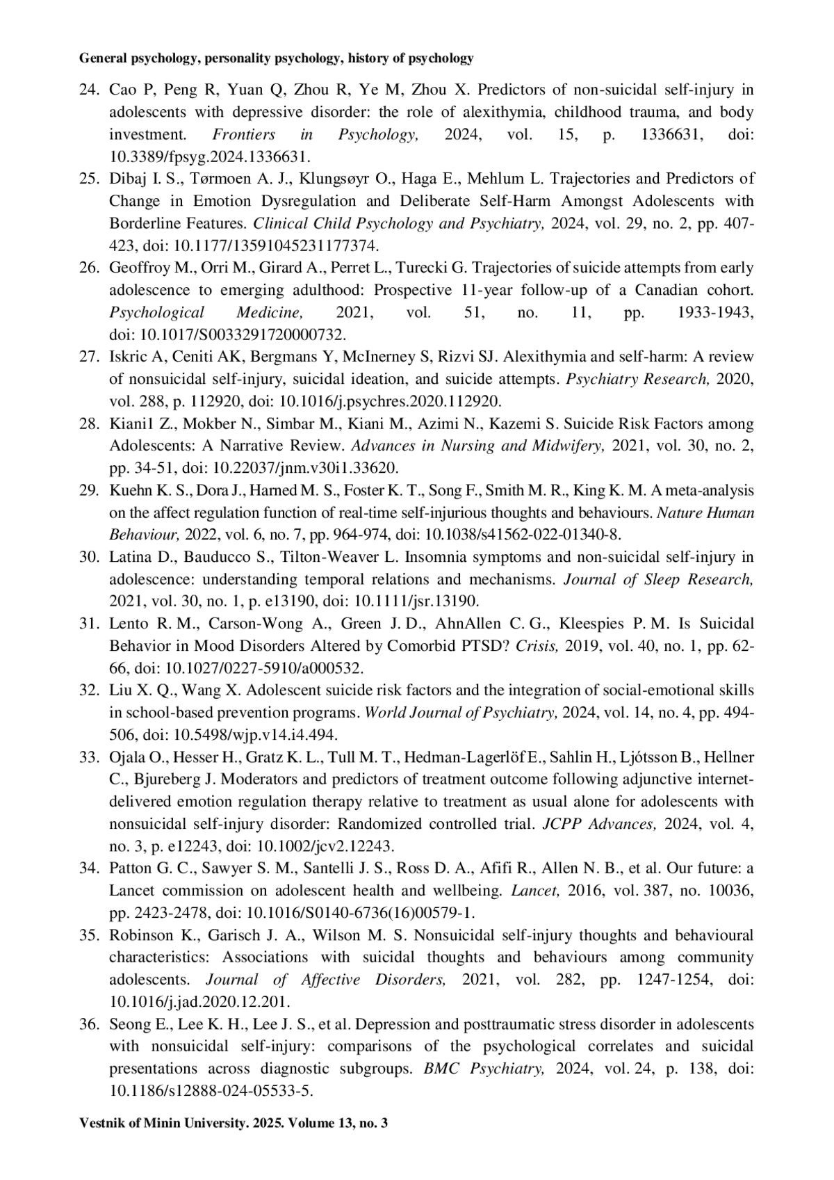 24. Cao P, Peng R, Yuan Q, Zhou R, Ye M, Zhou X. Predictors of non-suicidal self-injury in adolescents with depressive disorder: the role of alexithymia, childhood trauma, and body investment // Frontiers in Psychology. 2024. Vol. 15. P. 1336631. https://doi.org/10.3389/fpsyg.2024.1336631.