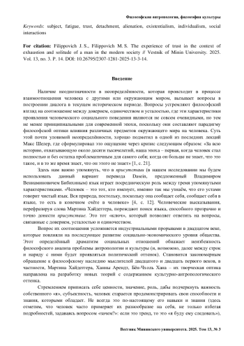 Введение. В современную философскую оптику попадают феномены, раскрывающие антропологическую субъектность как самого человека, так и в отношении с другими. Эти феномены тем не менее могут рассматриваться и самостоятельно. В статье мы рассмотрим некоторые из них, которые, как нам кажется, выходят на первую линию в настоящее время: одиночество, усталость и доверие. В философско-антропологических подходах мыслителей двадцатого и двадцать первого веков (Х. Арендт, М. Шеллер, М. Хайдеггер, Бён-Чхоль Хан и другие) усматривается ответ на вопрос о том, кто такой человек: каковы его место, мера и влияние в новой структурной реальности, которую он создаёт. Материалы и методы. Материалом для исследования стали работы отечественных и зарубежных философов, которые были проанализированы с использованием герменевтического, философско-компаративистского методов. В частности, были изучены конкретные характеристики, описывающие связь человека с окружающей реальностью. Результаты исследования. Проведённое исследование показывает, что человек становится личностью при условии осмысленной работы, что обуславливается предлагаемым ему выбором в условиях фрагментарности общества. Из-за частичного, разрозненного, фрагментарного процесса взаимодействия человека с обществом первый склонен не столько к обогащению своей личности, сколько к потребительскому времяпровождению. Через категорию доверия это звучит следующим образом: у того, кто доверяет, больше времени прожить жизнь полно, поскольку он знает, чего ему не хватает, и понимает, как этим можно пользоваться в жизни. Несмотря на кажущийся негативизм, усталость положительно стимулирует человека к осознанию имеющихся навыков и социального опыта, а также является «паузой», т. е. адаптацией накопившегося опыта. Обсуждение и заключения. Масштабные социальные потрясения приводят личность к состоянию отчуждённости, что выражается в стремлении к одиночеству, при этом ощущение усталости может стать ключом к изменению ситуации. Современное общество говорит, что субъект может сделать, что звучит как вера в способности человека выполнить ту или иную задачу. Однако подобное размывание границ «не\могу» ведёт к тому, что возрастает уровень продуктивности и в некоторой степени изнурённости, которая в конечном счёте может привести к переживанию одиночества и снижению доверия к окружающим людям. Большая самостоятельность приводит к апатии, в том числе к труду, которая отстраняет от окружающего мира, потому ведет к уменьшению доверия. Однако ключевым превентивным механизмом в современном обществе может стать дистанцированность в форме усталости, которая предъявляет обществу не сколько равнодушие, сколько совершенное волевое решение «прерваться на перерыв», а значит, ожидание от общества доверительного отношения.
