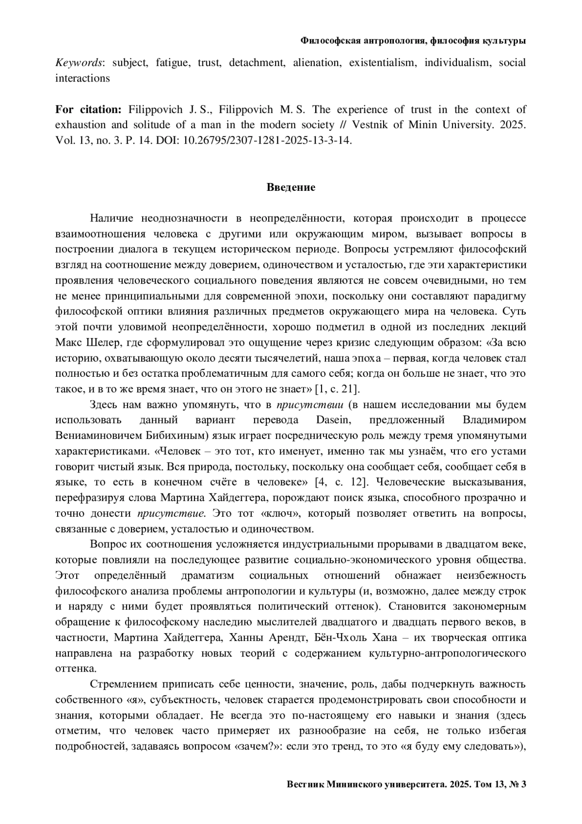 6. Биричева Е. В. Экзистенциальный смысл доверия // Вестник Санкт-Петербургского университета. Философия и конфликтология. 2023. Т. 9, вып. 1. С. 4-17.
