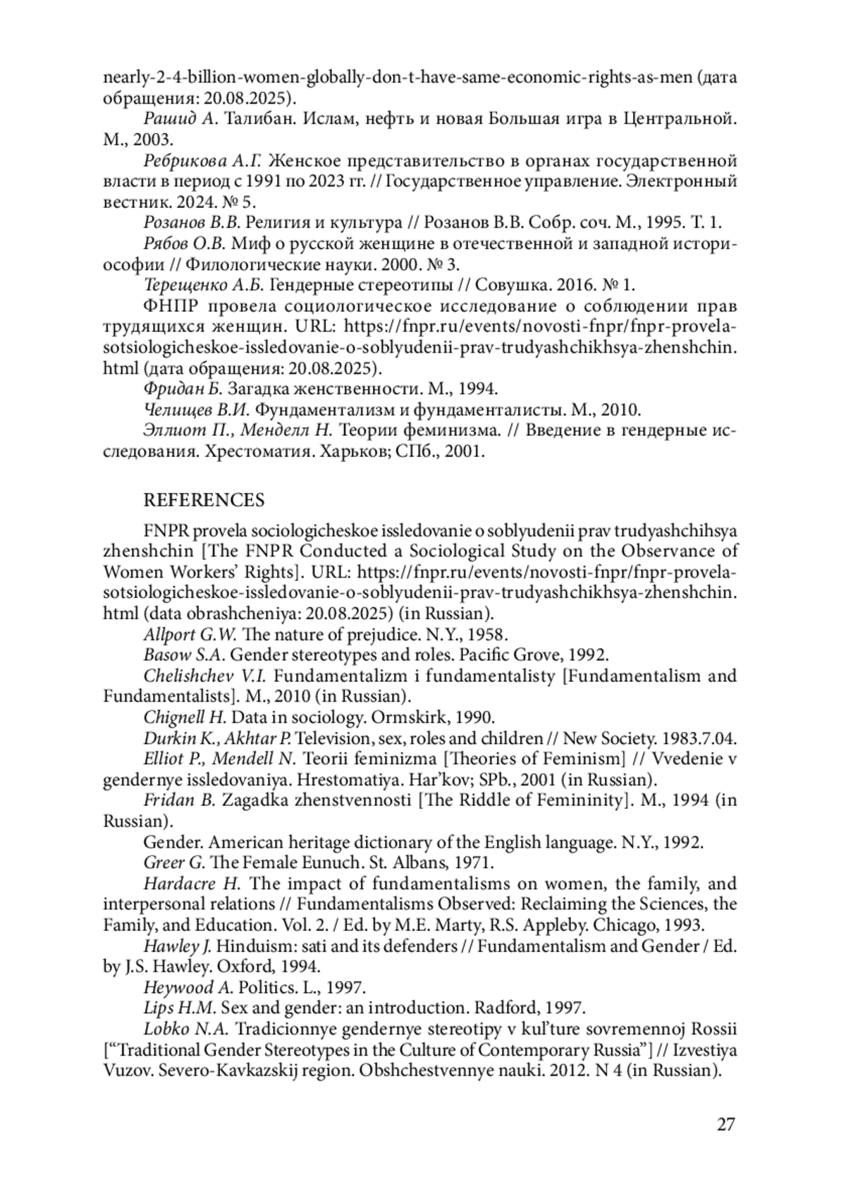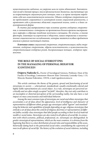 Настоящая статья продолжает тему генезиса, распространения и функционирования в обществе социальных стереотипов — схематизированных, стандартизированных, обычно эмоционально окрашенных и обладающих высокой устойчивостью представлений о социальном объекте. Как правило, стереотипы воспринимаются некритически и часто просто принимаются “на веру”, поэтому не только способствуют неполному или искаженному восприятию окружающей действительности, но и реально влияют на массовое сознание и индивидуальное поведение. В числе наиболее распространенных разновидностей стереотипов расово — этнические стереотипы, аккумулирующие набор представлений о внешности, уровне интеллекта и характере представителей разных этносов; возрастные стереотипы, получившие название “эйджизм” и стандартизирующие поведение и возможности людей в зависимости от возраста; религиозные стереотипы, воплощающие набор представлений о содержании религиозных доктрин или представителях разных конфессий; социально-классовые стереотипы, маркирующие людей в зависимости от уровня материального достатка или социального статуса. Стереотипы также укоренены во всех сферах социальной жизни, в связи с чем выделяют экономические, политические, профессиональные и т. п. стереотипы. В гендерных стереотипных представлениях, которые являются наиболее распространенными, очевидно изначально четкое распределение социальных ролей и обязанностей полов, исторически восходящее к патриархальному общественному устою, закрепляющему превосходство мужчины во всех сферах социальной жизни. История эволюции социальных отношений, в том числе и гендерных, свидетельствует о том, что патриархальные взгляды и стереотипные представления о женственности и мужественности медленно, но уверенно шли по пути обновлений. Значительный вклад в данный процесс внесло феминистское движение, выступающее как за возрастающую социальную роль женщин, так и за право женщины определять себя как самостоятельную личность. Однако гендерные стереотипы все же продолжают сохраняться в культурной основе социальной реальности, и проявляют себя в различных областях социальной жизни, хотя и в более завуалированной форме. В статье рассматриваются три основные группы гендерных стереотипов, в соответствии с которыми на протяжении долгого времени выстраивались маркеры и образцы поведения мужчины и женщины. Их генезис, а также факторы, влияющие на укрепление в обществе, нашел отражение в многочисленных социологических исследованиях, которые являются особым предметом анализа в рамках настоящей статьи.