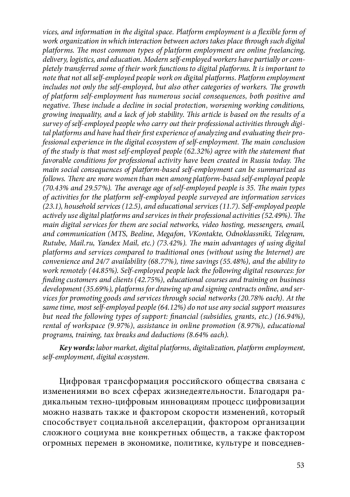 Современный рынок труда трансформируется под воздействием ускоренного развития цифровых технологий и внедрения цифровых платформ. Цифровая платформа представляет собой информационную систему, объединяющую различные типы акторов (представители государственных органов, коммерческих и некоммерческих организаций, физические лица и др.) и позволяющую им обмениваться цифровыми продуктами, услугами и информацией в цифровом пространстве. Платформенная занятость представляет собой гибкую форму организации труда, при которой взаимодействие между акторами осуществляется через такие цифровые платформы. Наиболее распространенными видами платформенной занятости являются онлайн-фриланс, доставка, логистика и образование. Современные самозанятые частично или полностью перенесли часть своих трудовых функций на цифровые платформы. Важно отметить, что не все самозанятые трудятся на цифровых платформах. И в платформенную занятость включены не только самозанятые, но и другие категории работников. Рост платформенной самозанятости влечет за собой многочисленные социальные последствия: как положительные, так и отрицательные. Среди них: снижение уровня социальной защиты, ухудшение условий труда, рост неравенства и отсутствие стабильности труда. Данная статья основана на результатах опроса тех самозанятых, кто осуществляет свою профессиональную деятельность через цифровые платформы и столкнулся с первым опытом анализа и оценки опыта своей профессиональной деятельности на цифровой экосистеме самозанятости. Главный вывод исследования: большинство самозанятых согласны (62,32%) с утверждением, что сегодня в России созданы благоприятные условия осуществления профессиональной деятельности. Основными социальными последствиями платформенной самозанятости можно назвать следующие. Среди платформенных самозанятых женщин больше, чем мужчин (70,43% и 29,57%). Средний возраст самозанятых — 35 лет. Основными видами деятельности для опрошенных платформенных самозанятых являются: информационные услуги (23,1), бытовые (12,5) и образовательные (11,7). Самозанятые активно пользуются цифровыми платформами и сервисами в своей профессиональной деятельности (52,49%). Основными цифровыми сервисами для них являются соцсети, видеохостинги, мессенджеры, почта, связь (приложения МТС, “Билайн”, “Мегафон”, “ВКонтакте”, “Одноклассники”, Telegram, Rutube, “Почта Mail. ru”, “Яндекс почта” и др.) (73,42%). Главными преимуществами в использовании цифровых платформ и сервисов по сравнению с традиционными (без использования интернета) названы: удобство и доступность 24/7 (68,77%), экономия времени (55,48%), возможность работы удаленно (44,85%). Самозанятым не хватает следующих цифровых ресурсов: для поиска заказчиков и клиентов (42,75%), образовательных курсов и тренингов по развитию своего дела (35,69%), платформ для оформления и подписания договоров онлайн и сервисов для продвижения товаров и услуг через социальные сети (по 20,78%). При этом, большинство самозанятых (64,12%) не пользуются никакими мерами социальной поддержки, но нуждаются в следующих видах поддержки: финансовой (субсидии, гранты и др.) (16,94%), в аренде рабочего пространства (9,97%), содействии в продвижении в интернете (8,97%), в образовательных программах, в тренингах, налоговых льготах и вычетах (по 8,64%).