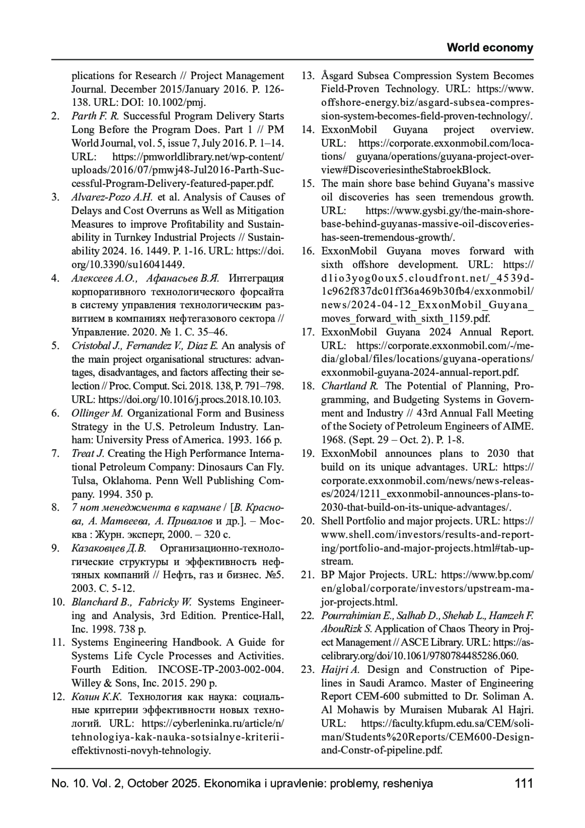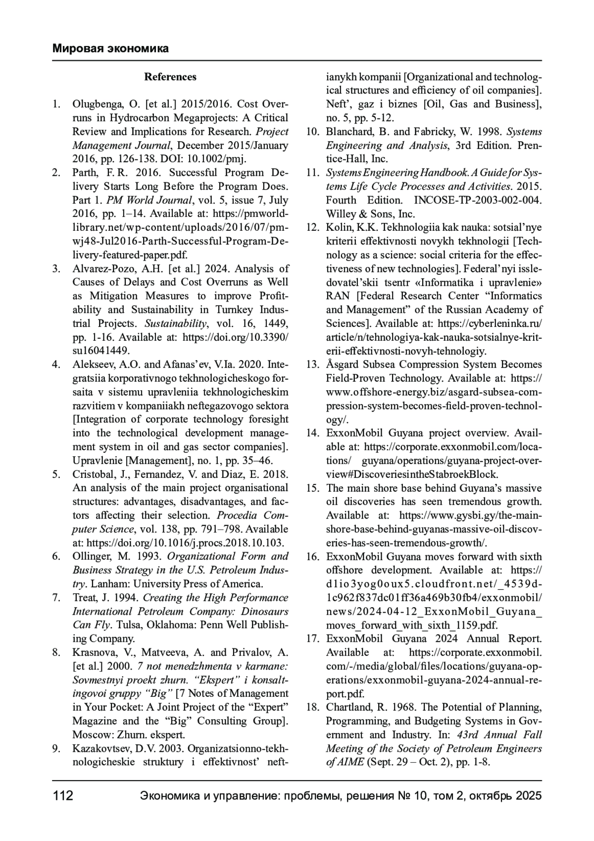 1. Olugbenga O. et al. Cost Overruns in Hydrocarbon Megaprojects: A Critical Review and Implications for Research // Project Management Journal. December 2015/January 2016. P. 126138. URL:. DOI: 10.1002/pmj